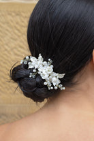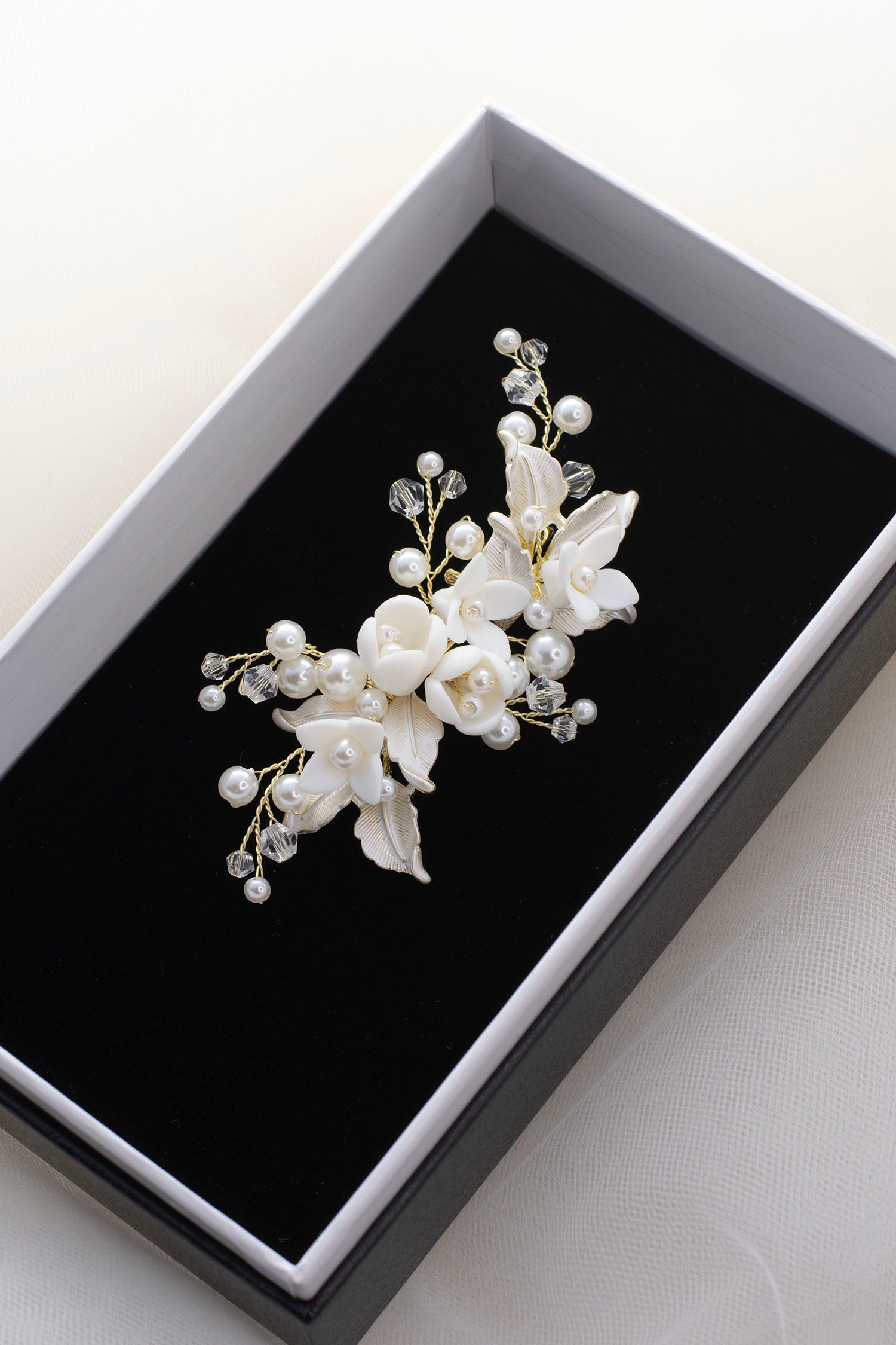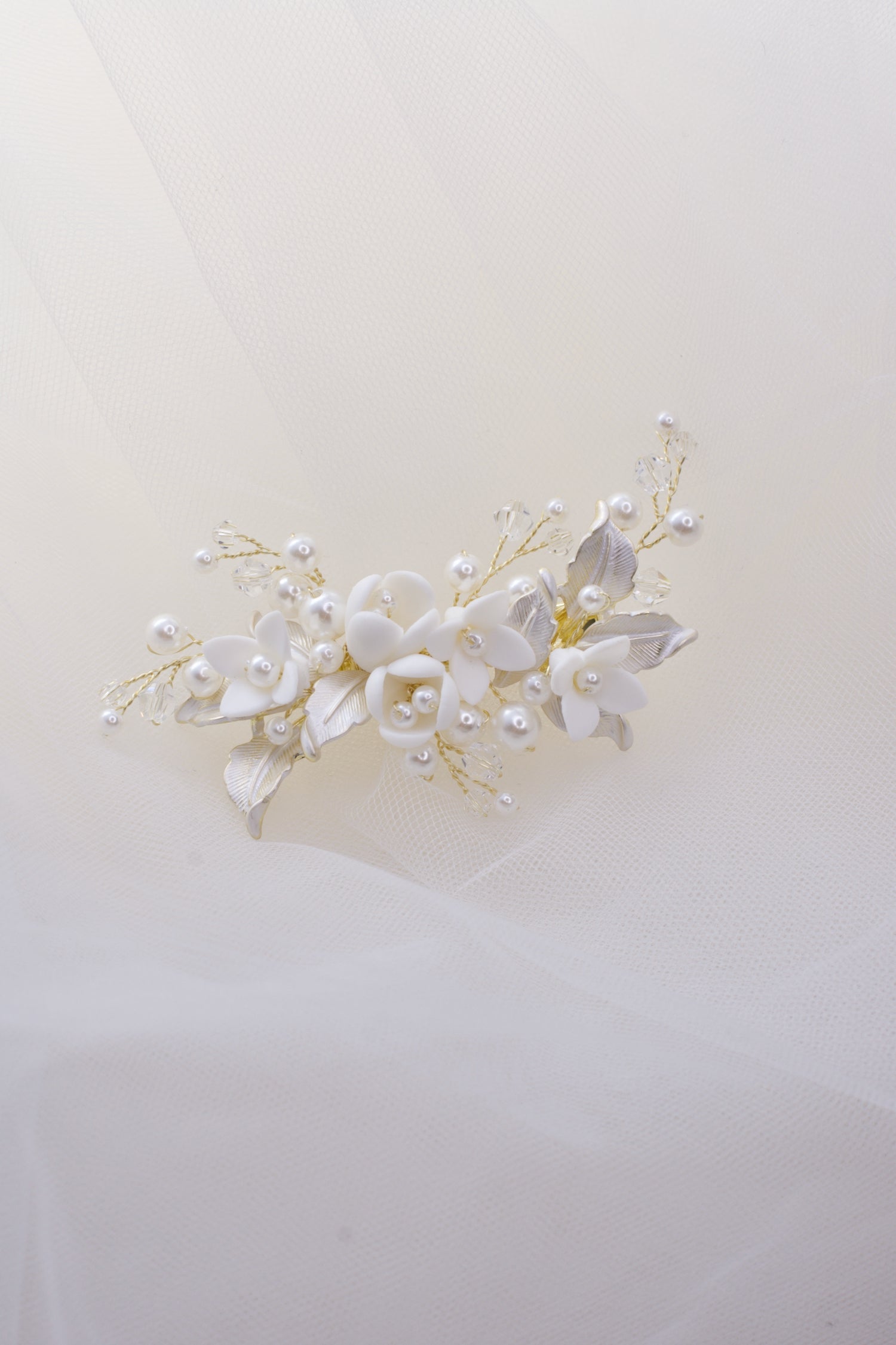 A angelic wave of pearl and porcelain, Angelina is a divine addition to your bridal look. Perfectly placed pearls, leaves and florals give this piece its ethereal name. Angelina is an easy to style headpiece; wear above your veil or place at the top of a bun. The ivory pearls and white ceramic pair perfectly with minimal gowns, and pick up on floral details. Feel the most divine on your your Wedding Day with Angelina.