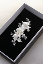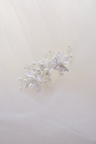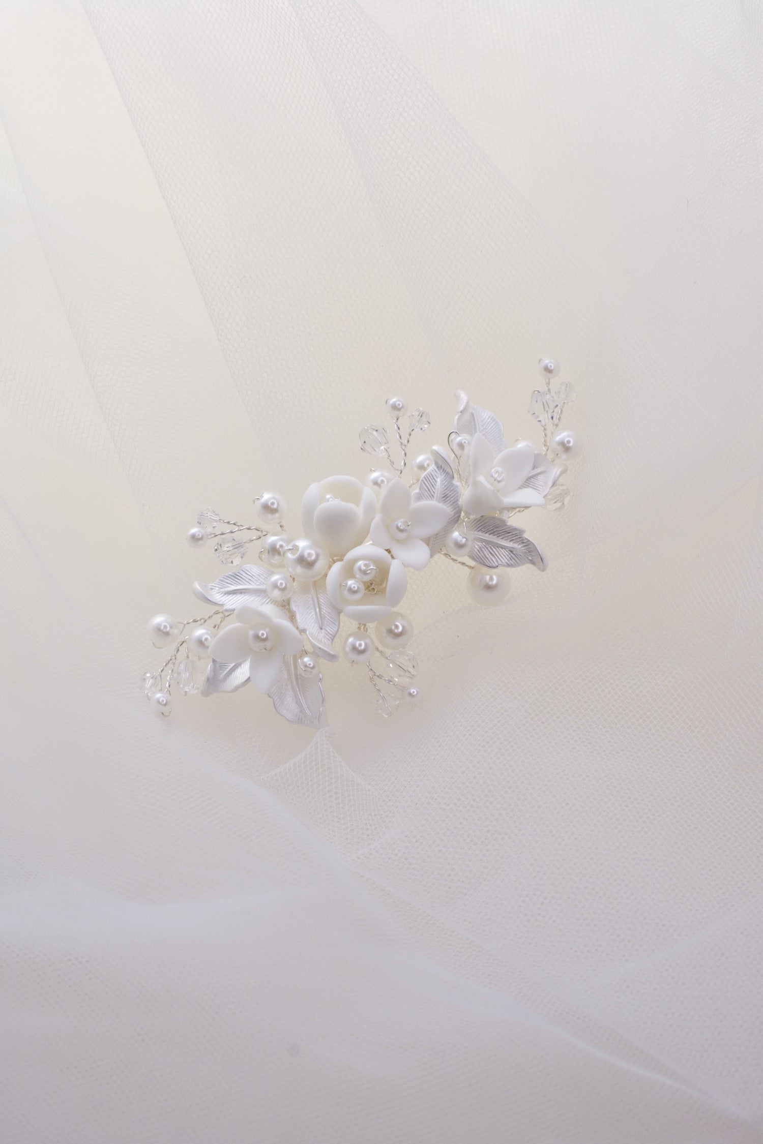 A angelic wave of pearl and porcelain, Angelina is a divine addition to your bridal look. Perfectly placed pearls, leaves and florals give this piece its ethereal name. Angelina is an easy to style headpiece; wear above your veil or place at the top of a bun. The ivory pearls and white ceramic pair perfectly with minimal gowns, and pick up on floral details. Feel the most divine on your your Wedding Day with Angelina.