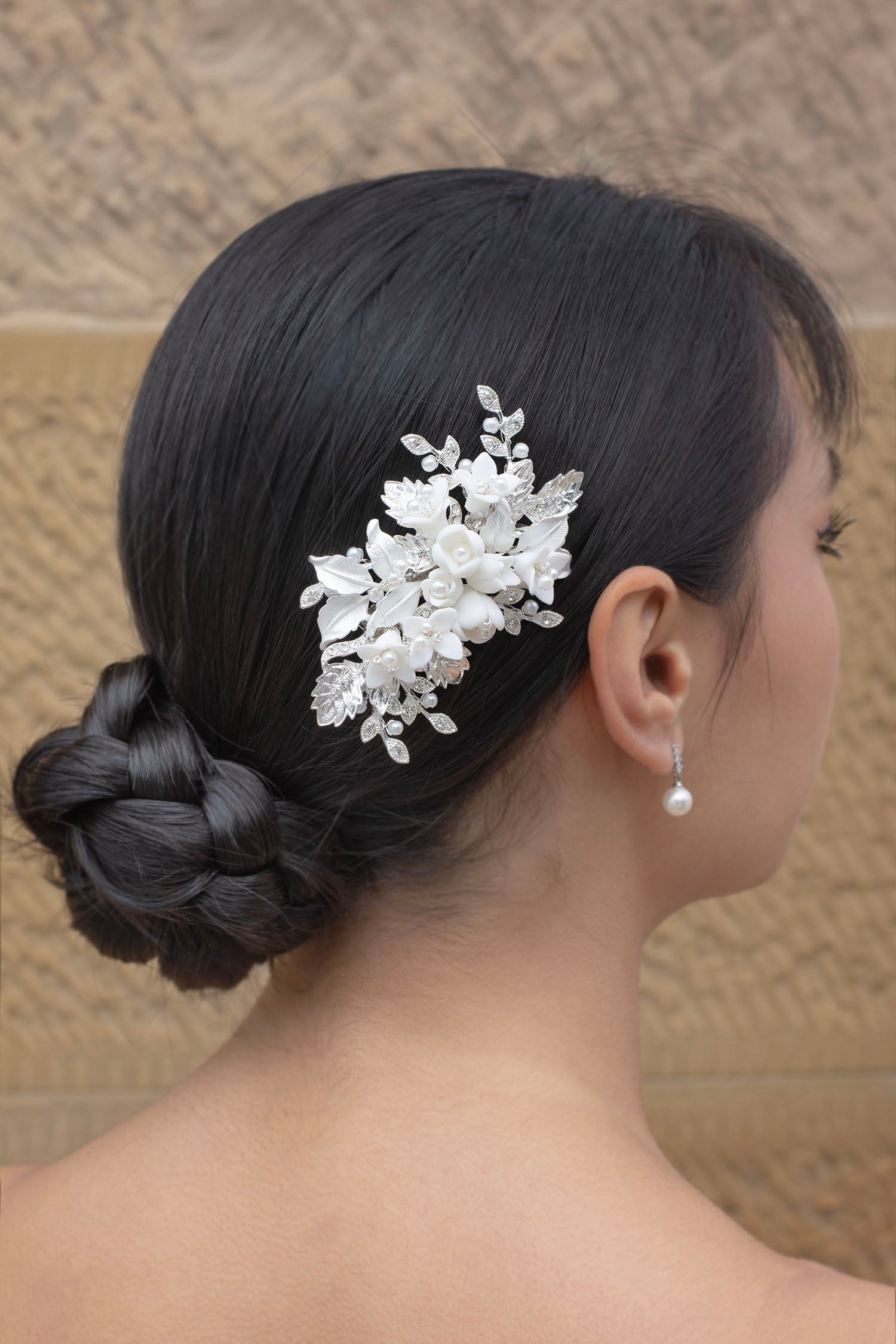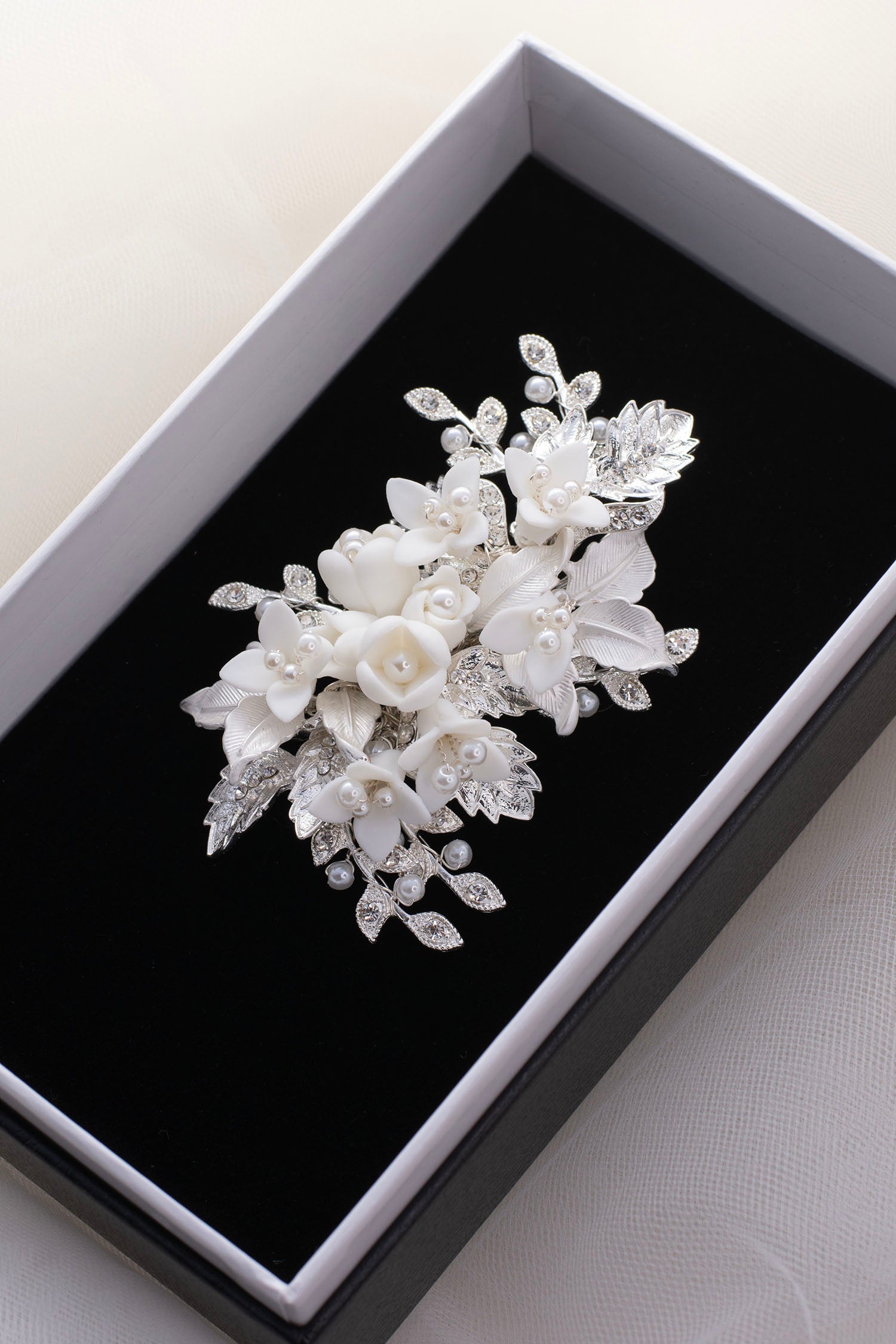 Highly encrusted and intricate, Aurora sparkles like no other. An incredibly detailed cluster of porcelain ceramic florals, metal leaves and dots of pearl. Aurora is a firework of ceramic and silver and will have your wedding party onlooking in awe. Attached with a strong clip, Aurora is held in the hair with ease. Let the magic begin with Aurora.