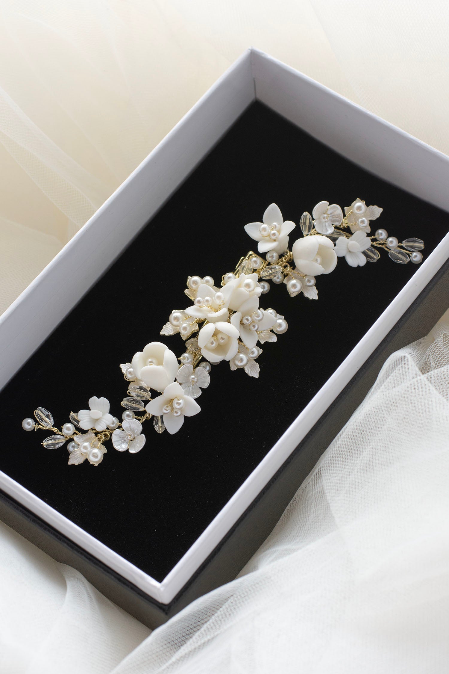 Be in full bloom on your wedding day with Charmaine. An exquisite floral design featuring an array of blossoming petals full of charm. White porcelain flowers and pearl are the most delicate match, perfect for the Bride. With a softness and alluring nature, Charmaine is the cherry on top for your Bridal look. Fixed with a strong clip at the back, Charmaine will feel solid and secure. A fantastic piece for the back of the head with all types of Bridal hairstyles. Be the bride you've always dreamed of being with Charmaine.