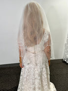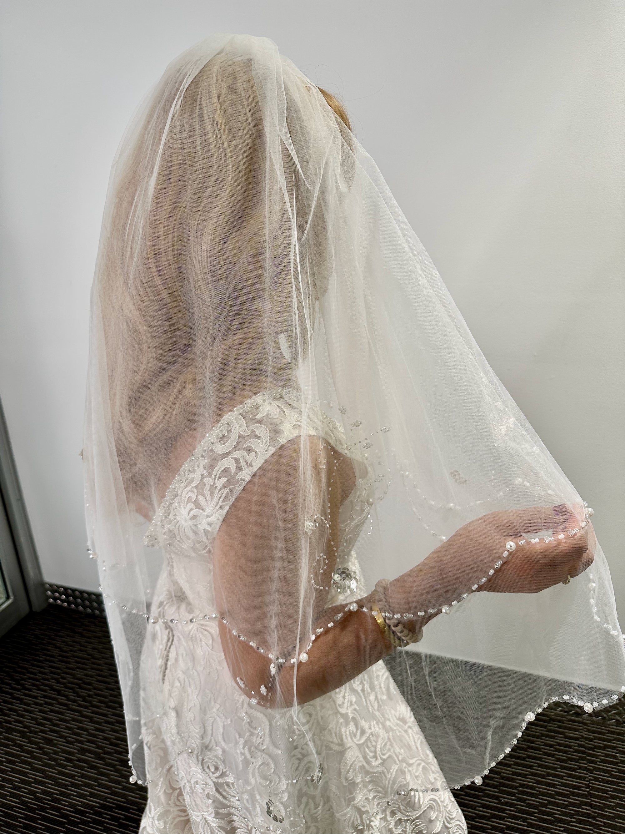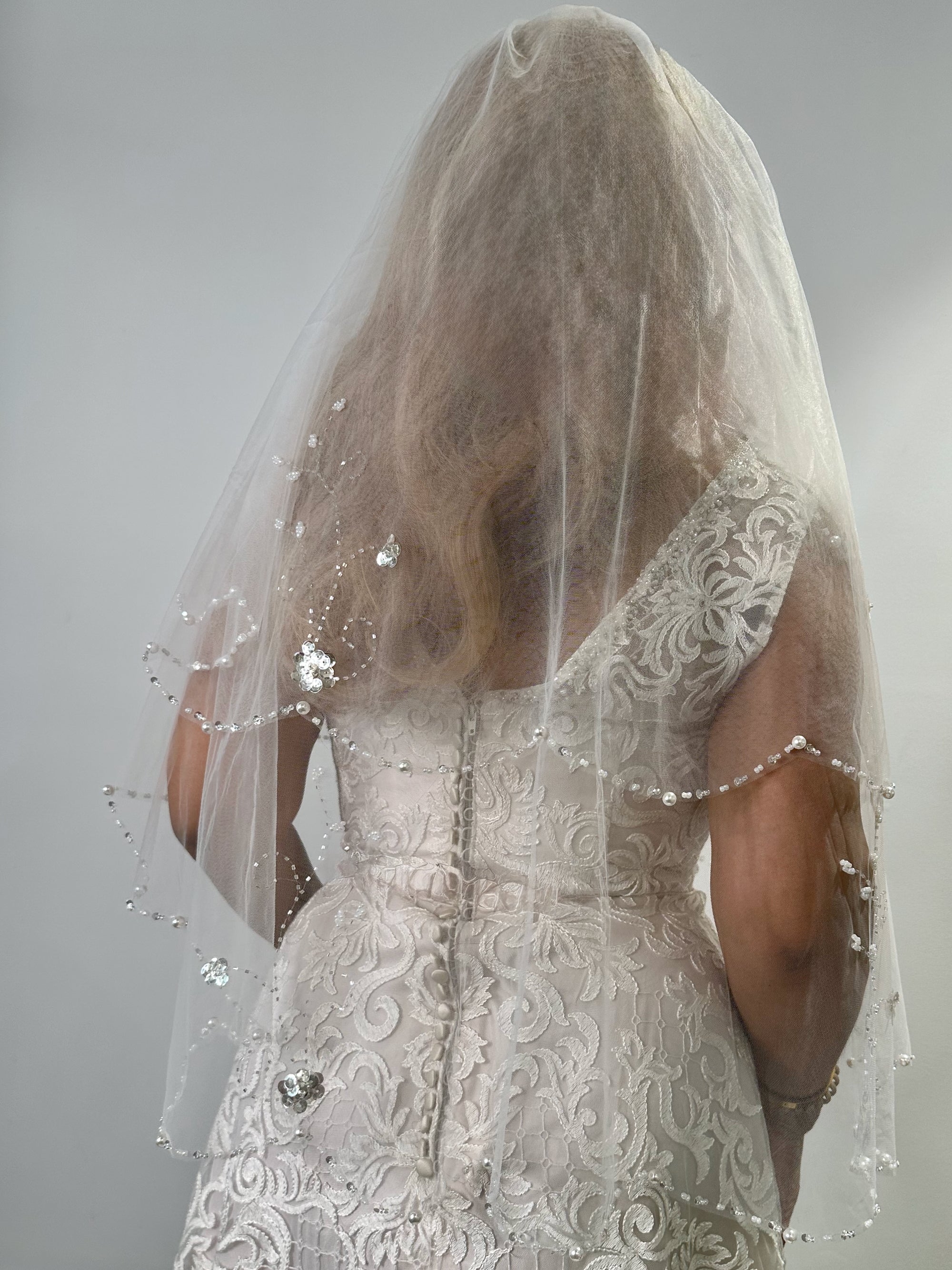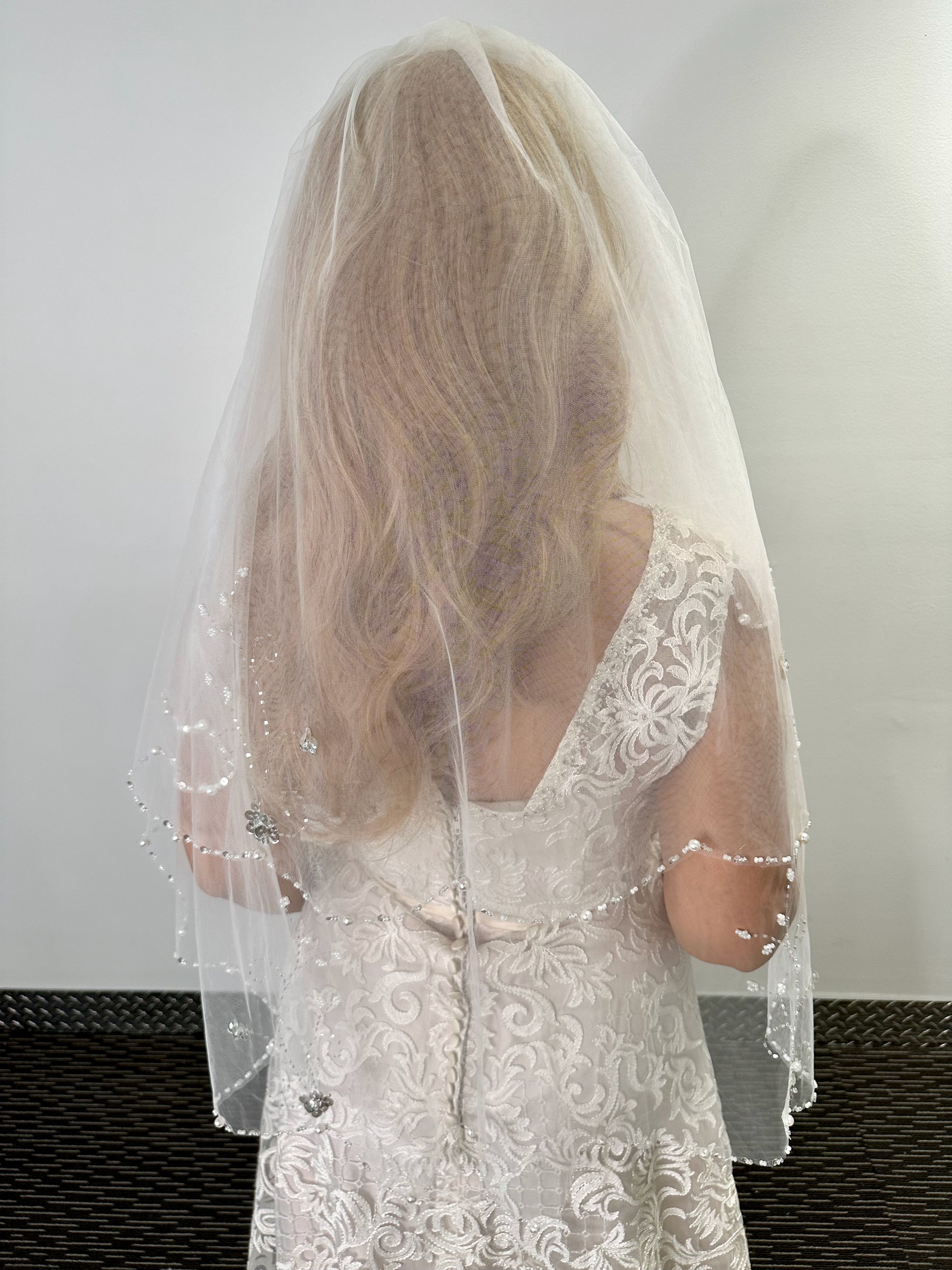 Dania has delightful shallow scallop edges detailed with pearls and a few crystals. A feature is a flower of shiny sequins at the base of a fine swirling detail up the veil. Dania is very easy to see through so your gown is very easy to see. Dania is made as a circle with a flexible transparent comb placed off centre to form two layers. The smaller Blusher layer is about 24" (60cm) and the longer layer is about 36" (90cm)