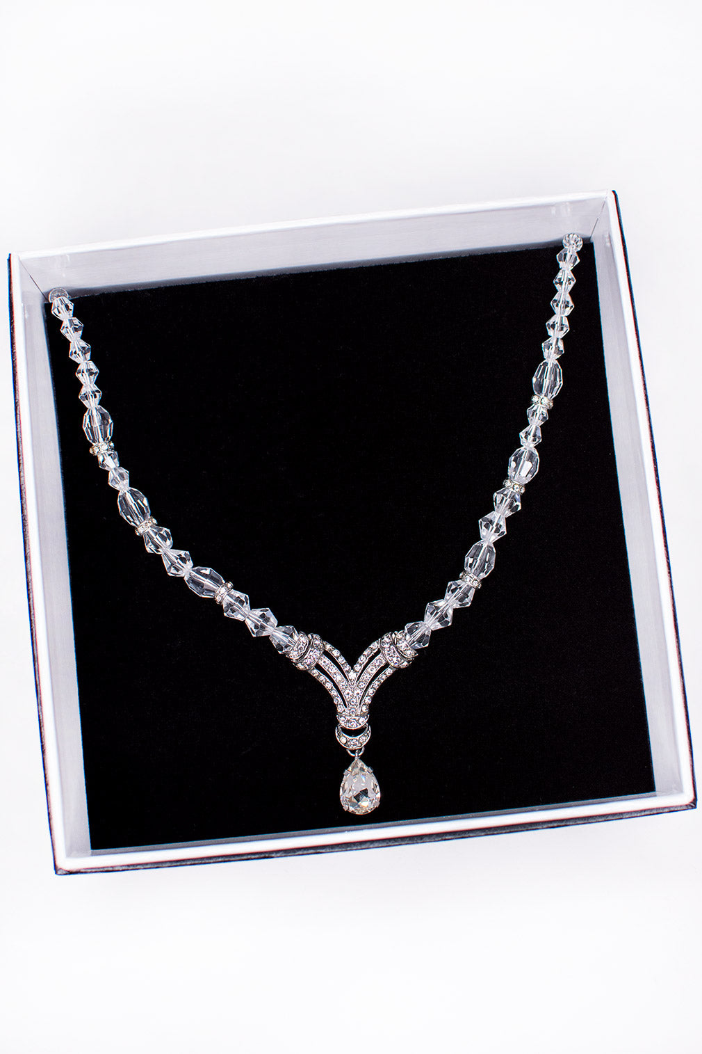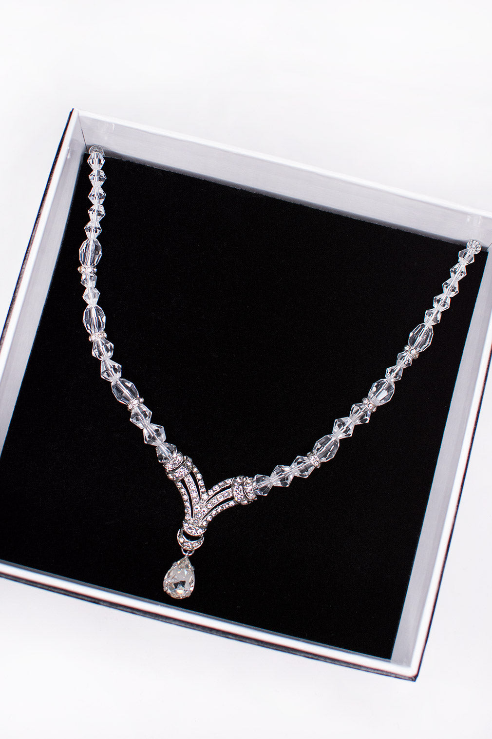 Dorothy is a beautiful clear crystal bead necklace which features a sparkling crystallised motif. Dorothy's quality crystal beads graduate from small to large from the either end of the necklace, meeting Dorothy's crystal encrusted metal motif at the centre. Tipped with a Swarovski pear-shaped stone, Dorothy will beautifully compliment your neckline and bridal ensemble. Dorothy is complete with an 5cm extension chain for you to easily adjust the necklace to your preference.