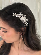 The Faye Comb is an elegant silver accessory featuring delicate sprigs of seed pearls and a fine ceramic flower at its center. Its smaller size offers a subtle yet refined touch, perfect for adding sophistication to any bridal hairstyle.
