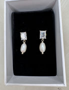 Be a confident Modern Bride wearing Harriet real freshwater pearl earrings. A fine rectangle Crystal stone tops the earring and a teardrop freshwater pearl dances below. The Crystal is in an open backed setting to allow light to play around within the stone. In white gold finish these are the earrings to walk down the aisle in. Every Bride would love these quality freshwater pearls with the beautiful cut edge rectangle crystal.