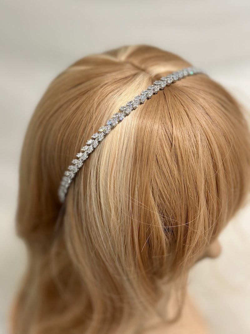 Hazel is a beautiful single row headband encrusted with gleaming navette-shaped crystals that stretch the length of the band to give a modern luxury look. The high quality eye-shaped zirconia stones are individually claw set in cups that stop short to reveal the headband's frame.