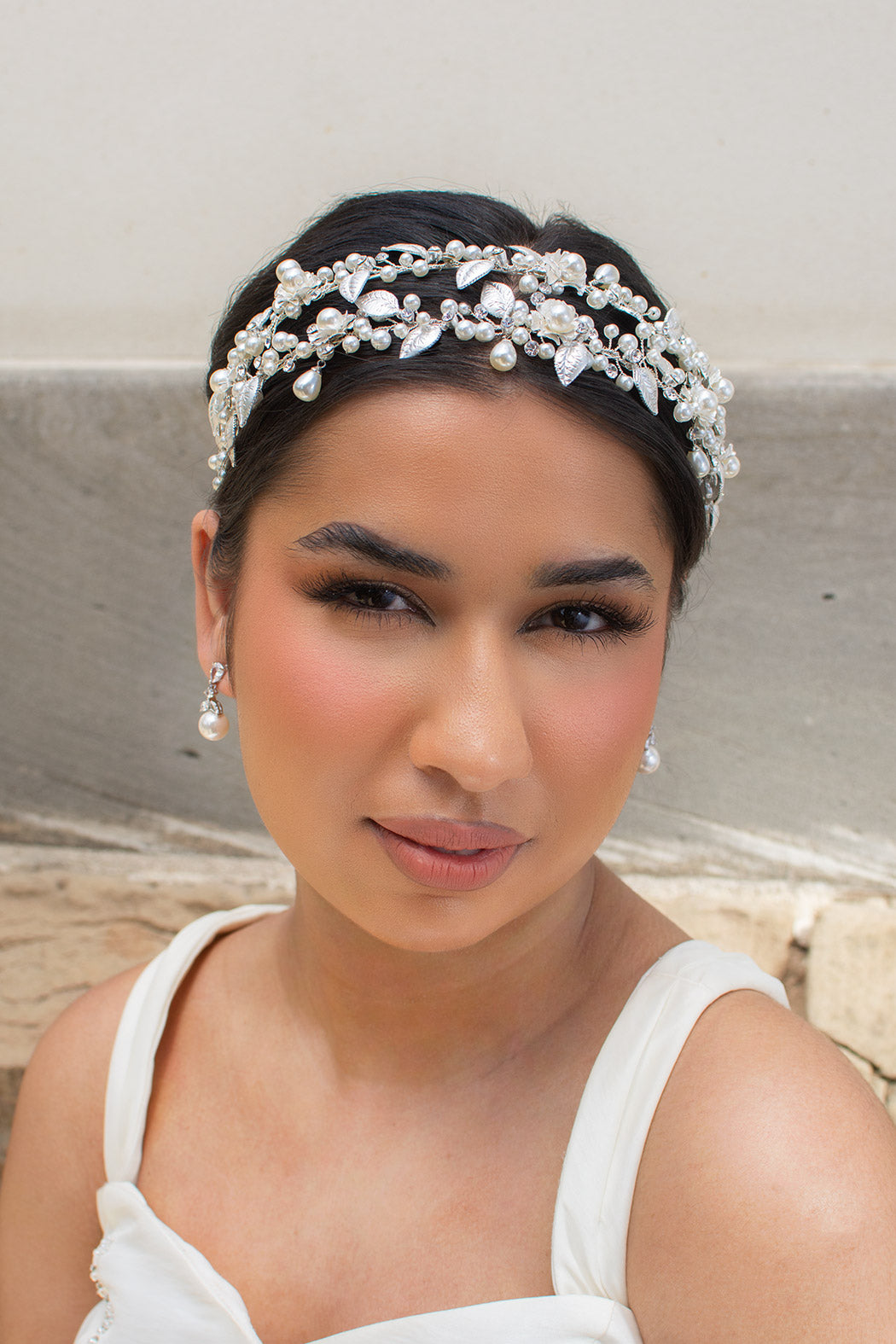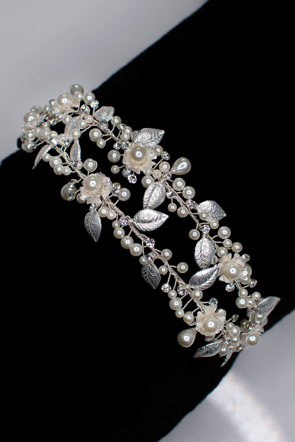 Holly is the essence of subtle elegance with soft pearlescent silver leaves and beautiful pearls nestling in tiny flowers. She is a lovely double row headband that can be adjusted to have the two rows a bit closer or farther apart.