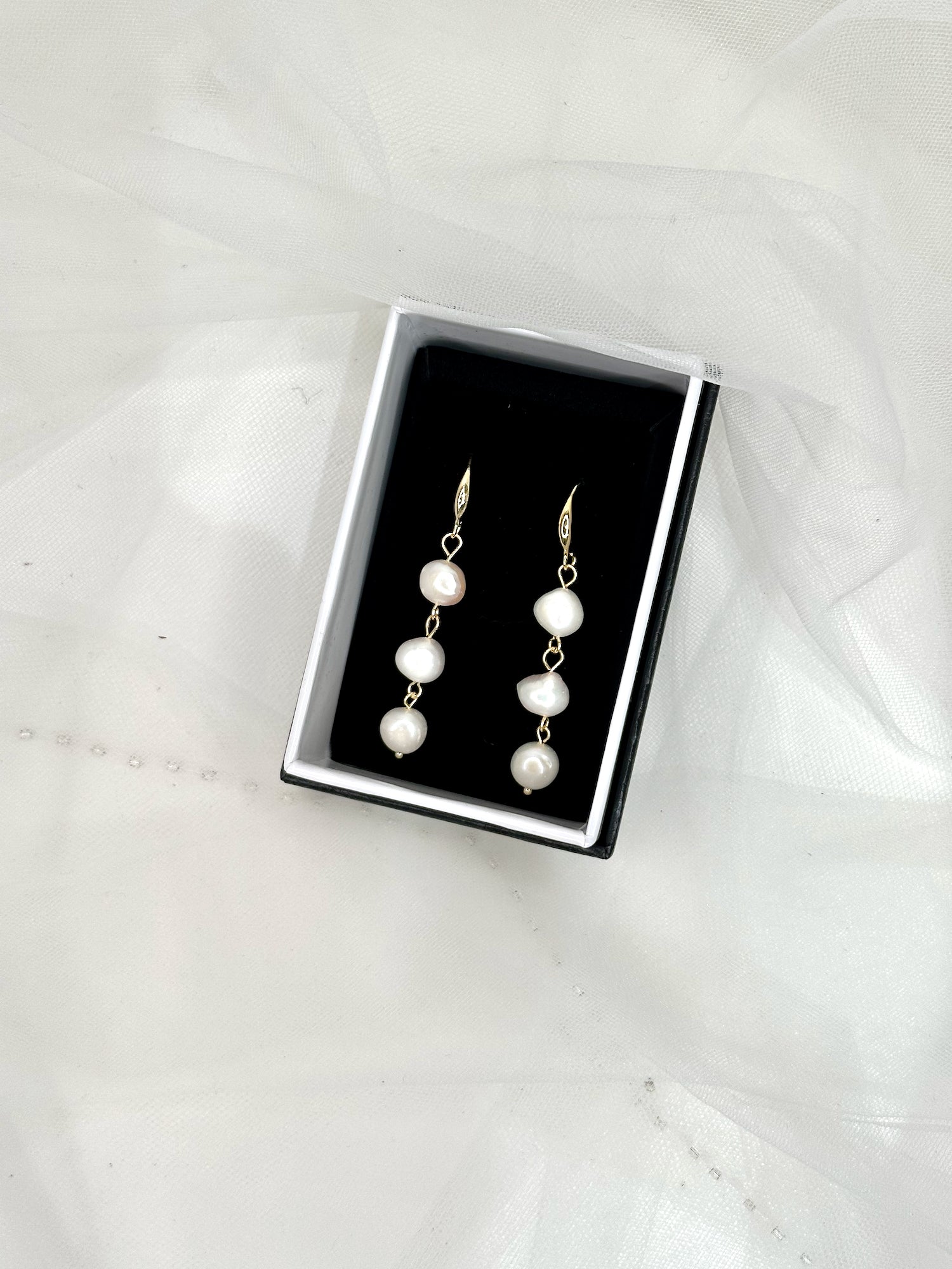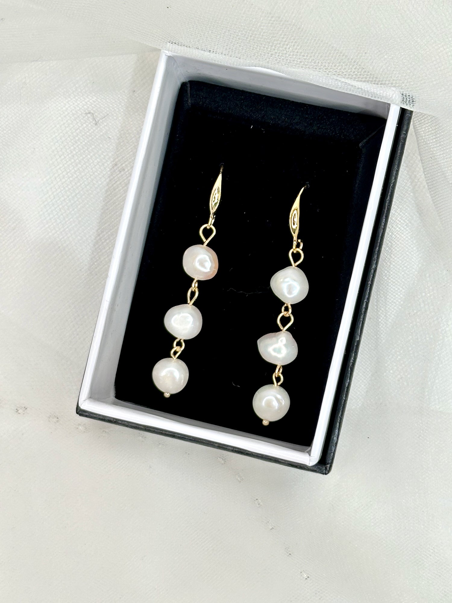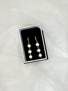 Lift your bridal ensemble with the Lettie Earrings, featuring three lustrous real freshwater pearls delicately suspended from elegant gold-plated hooks. These earrings offer a timeless sophistication, perfectly complementing your special day. Presented in a refined display box, they make an exquisite gift or keepsake.