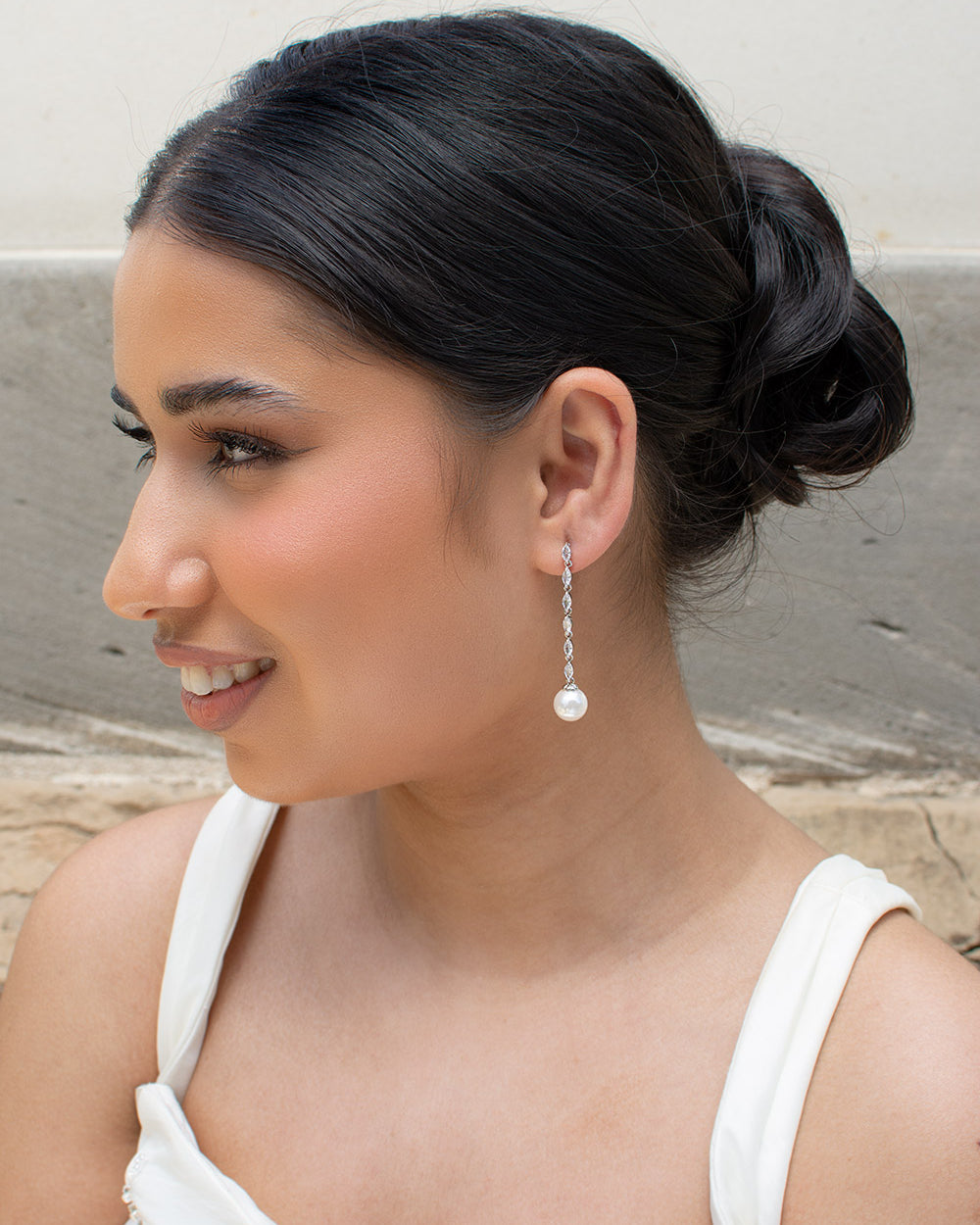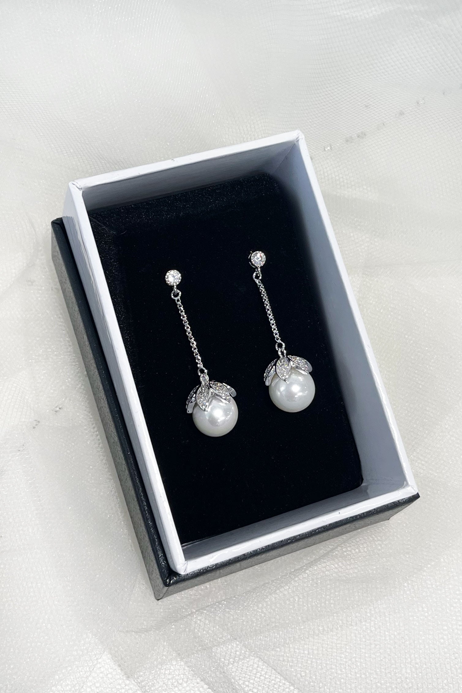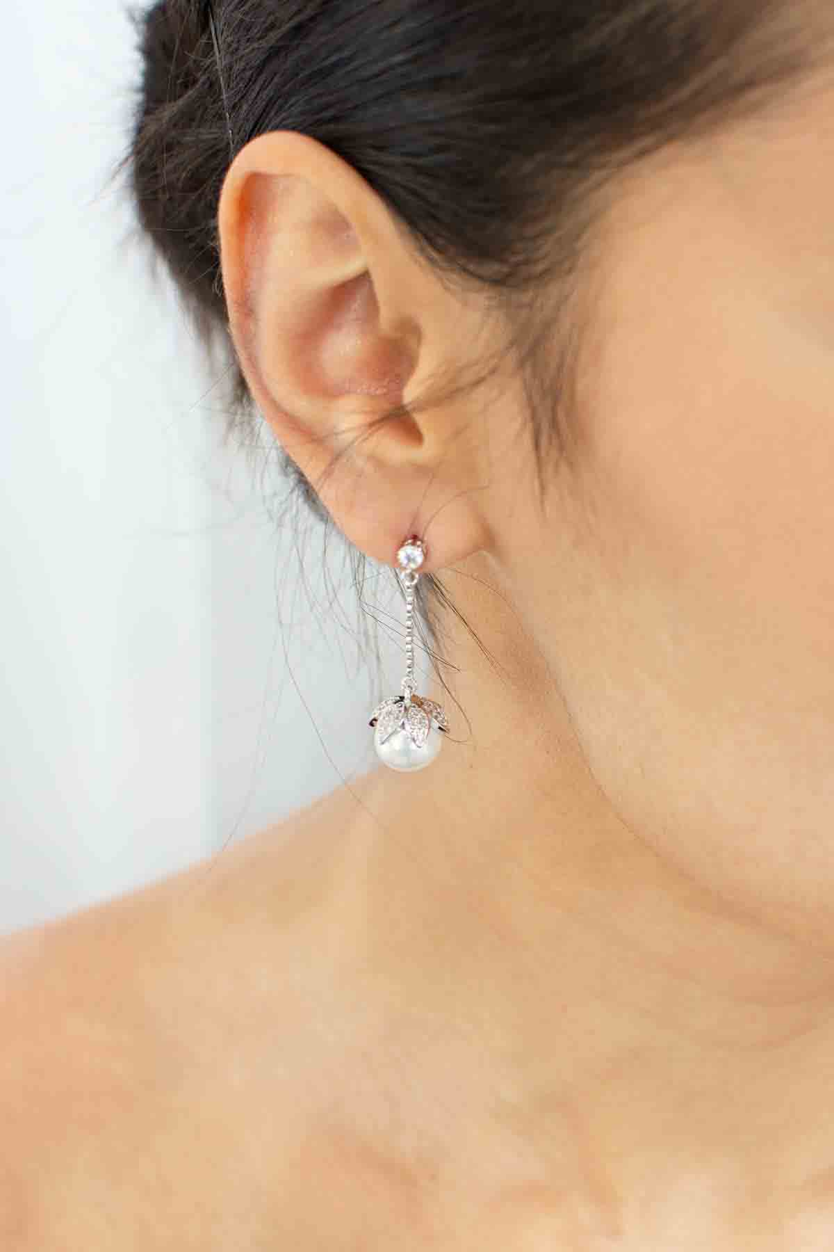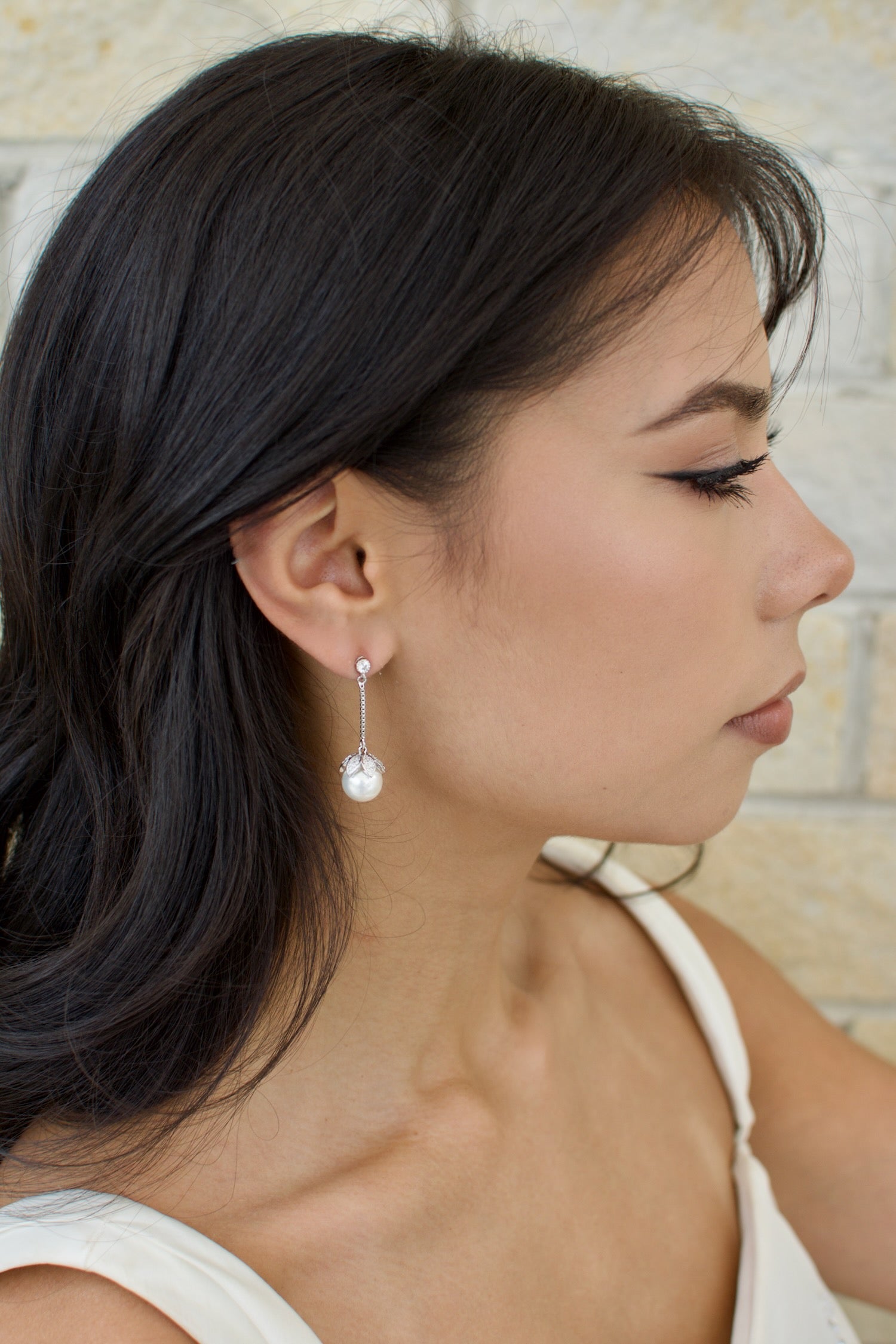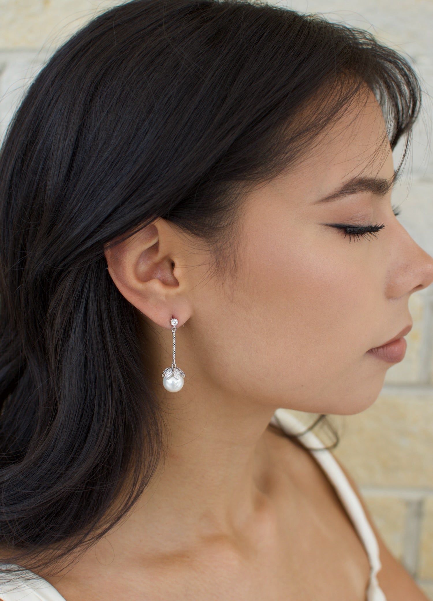 Lovely Lisa drop Pearl Earrings. If you love drop pearl earrings you will love wearing Lisa. For the Classic Elegant Bride of today a stylish pair of drop earrings can perfectly finish your look. A tiny crystal stud sits in the ear and a very fine flexible chain dangles a lustrous pearl held by a finely detailed cup. Tiny tiny crystals are set in each leaf of the cup and the earrings move freely and dance as you walk down the aisle.