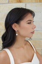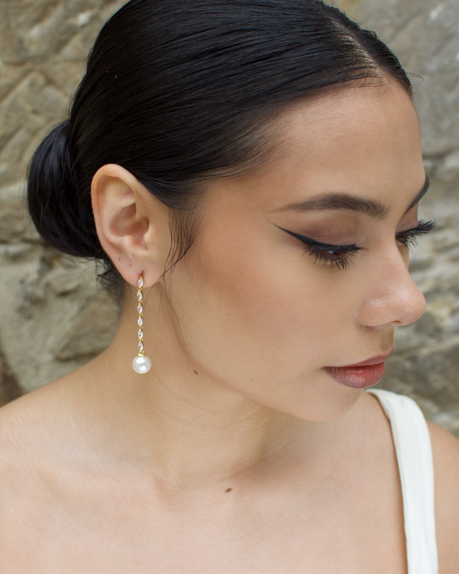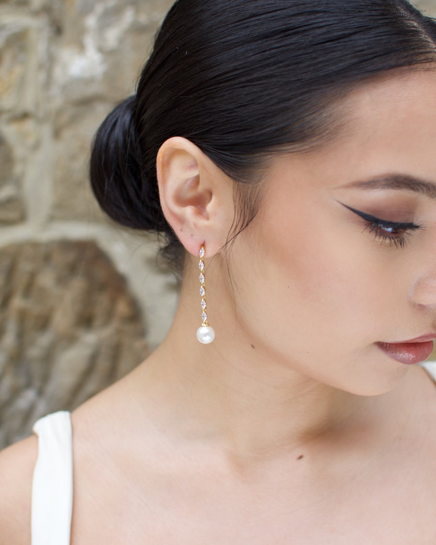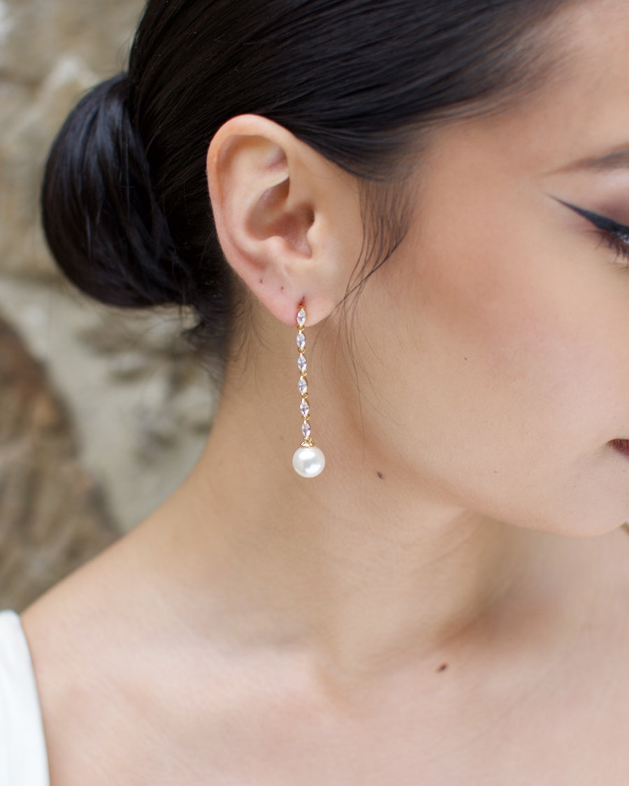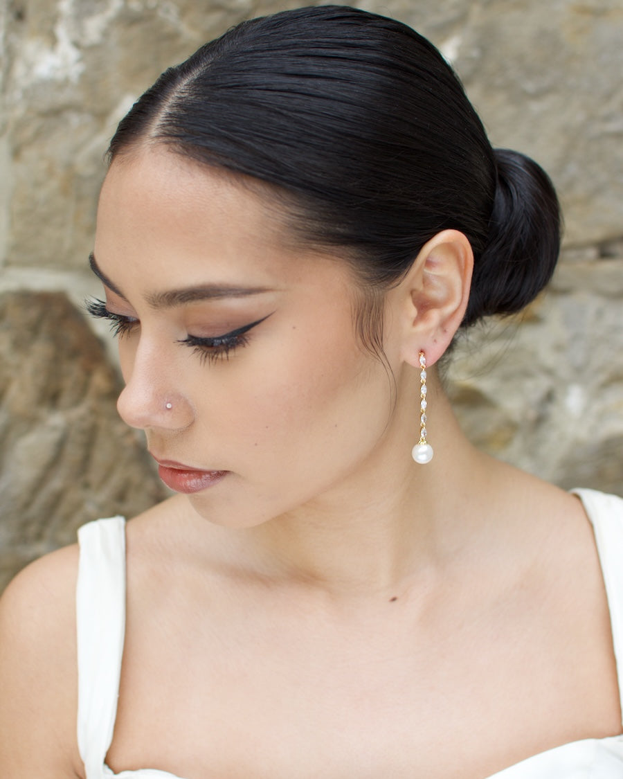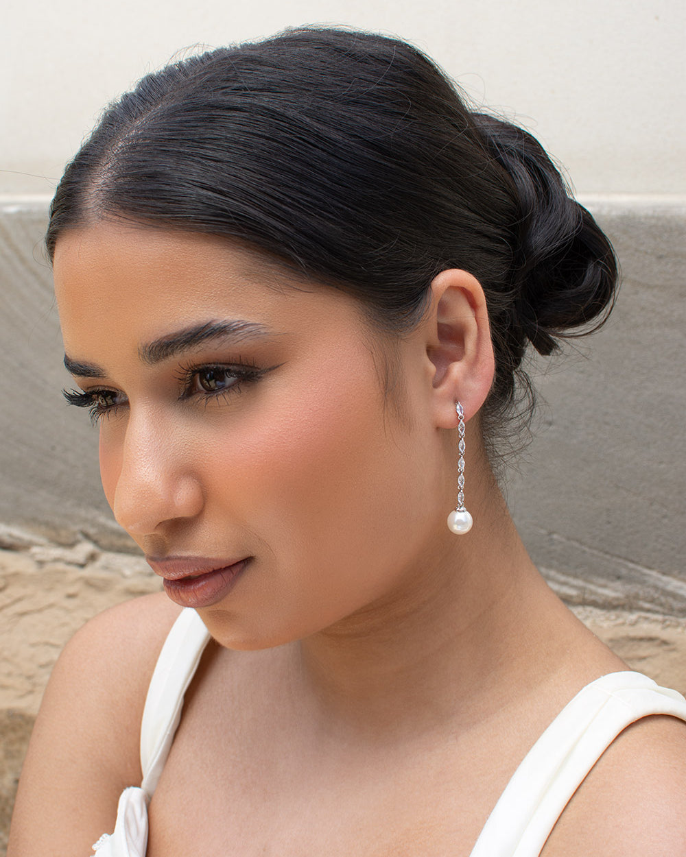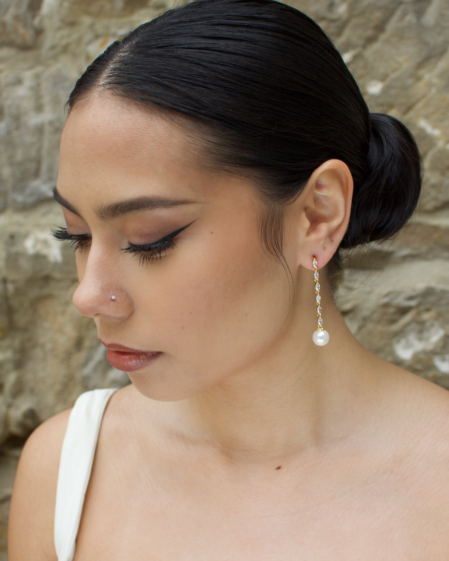 Lovely Lisa drop Pearl Earrings. If you love drop pearl earrings you will love wearing Lisa. For the Classic Elegant Bride of today a stylish pair of drop earrings can perfectly finish your look. A tiny crystal stud sits in the ear and a very fine flexible chain dangles a lustrous pearl held by a finely detailed cup. Tiny tiny crystals are set in each leaf of the cup and the earrings move freely and dance as you walk down the aisle.