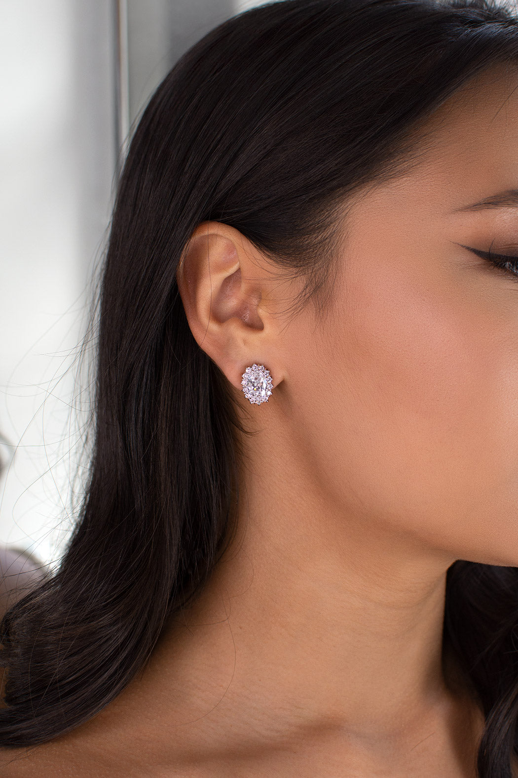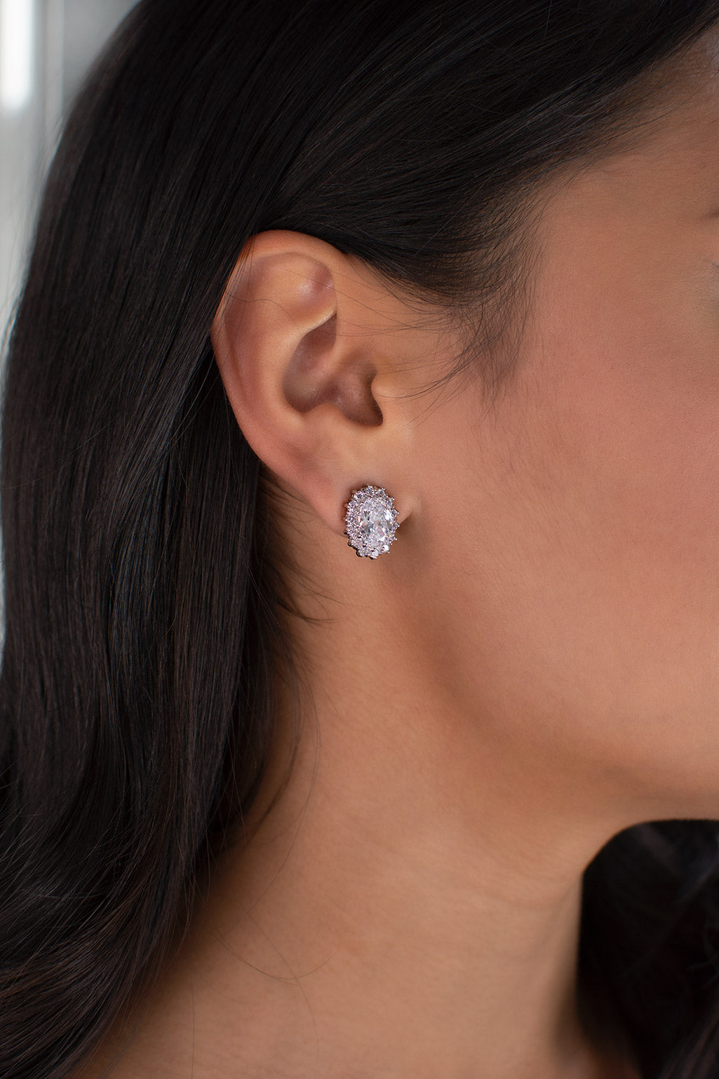 Mae is a post fitting earring with a lovely stone that is a long oval shape set with a surrounding border of crystals. So elegant and classic. Perfect for Brides and Bridesmaids.