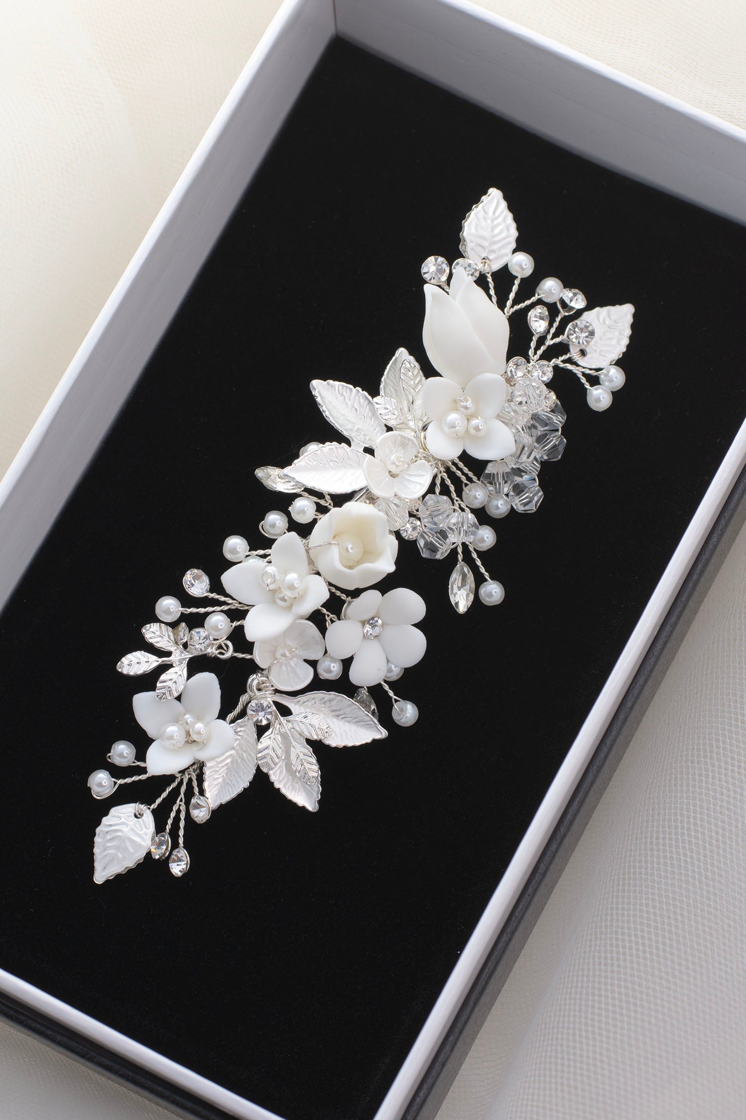 An exquisite garland of porcelain florals, dainty pearls and polished gold leaves, Marion is a piece to behold. Refined and delicate, Marion is a wondrous piece, making you feel like a dream. Perfect to decorate all Bridal hairstyles and easy to wear all day long. Be the bride you've always dreamed of being with Marion.