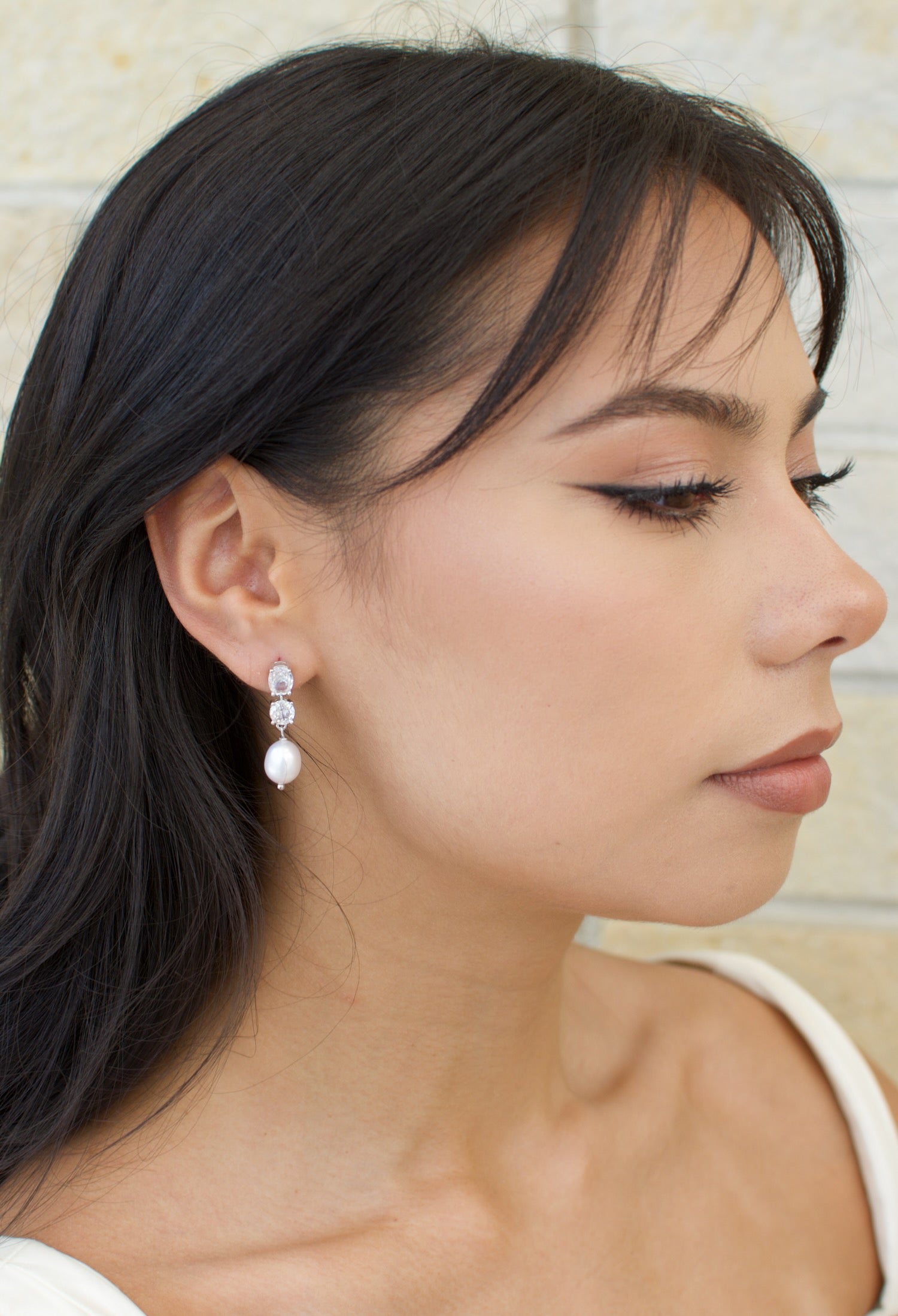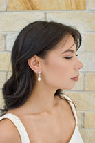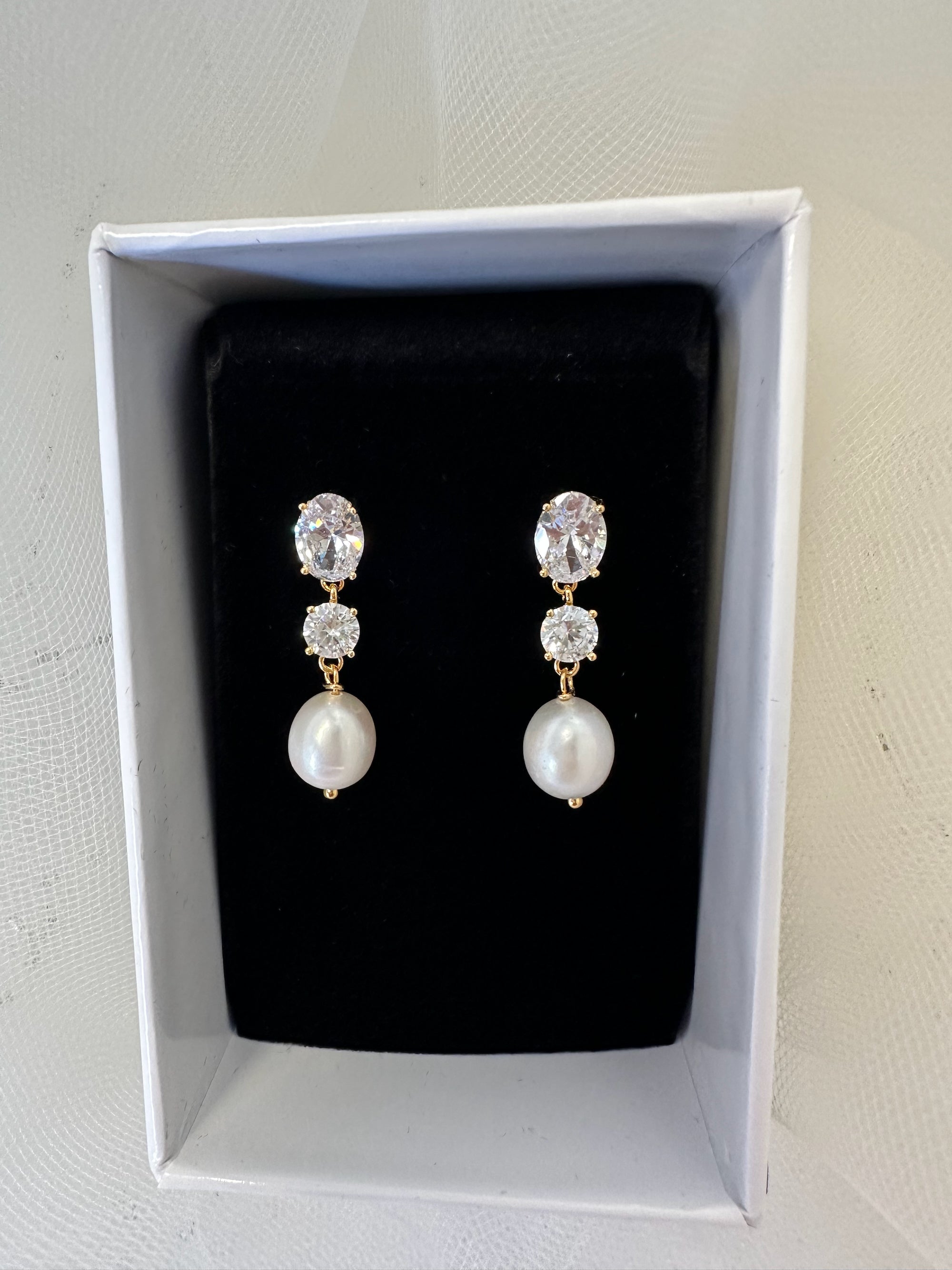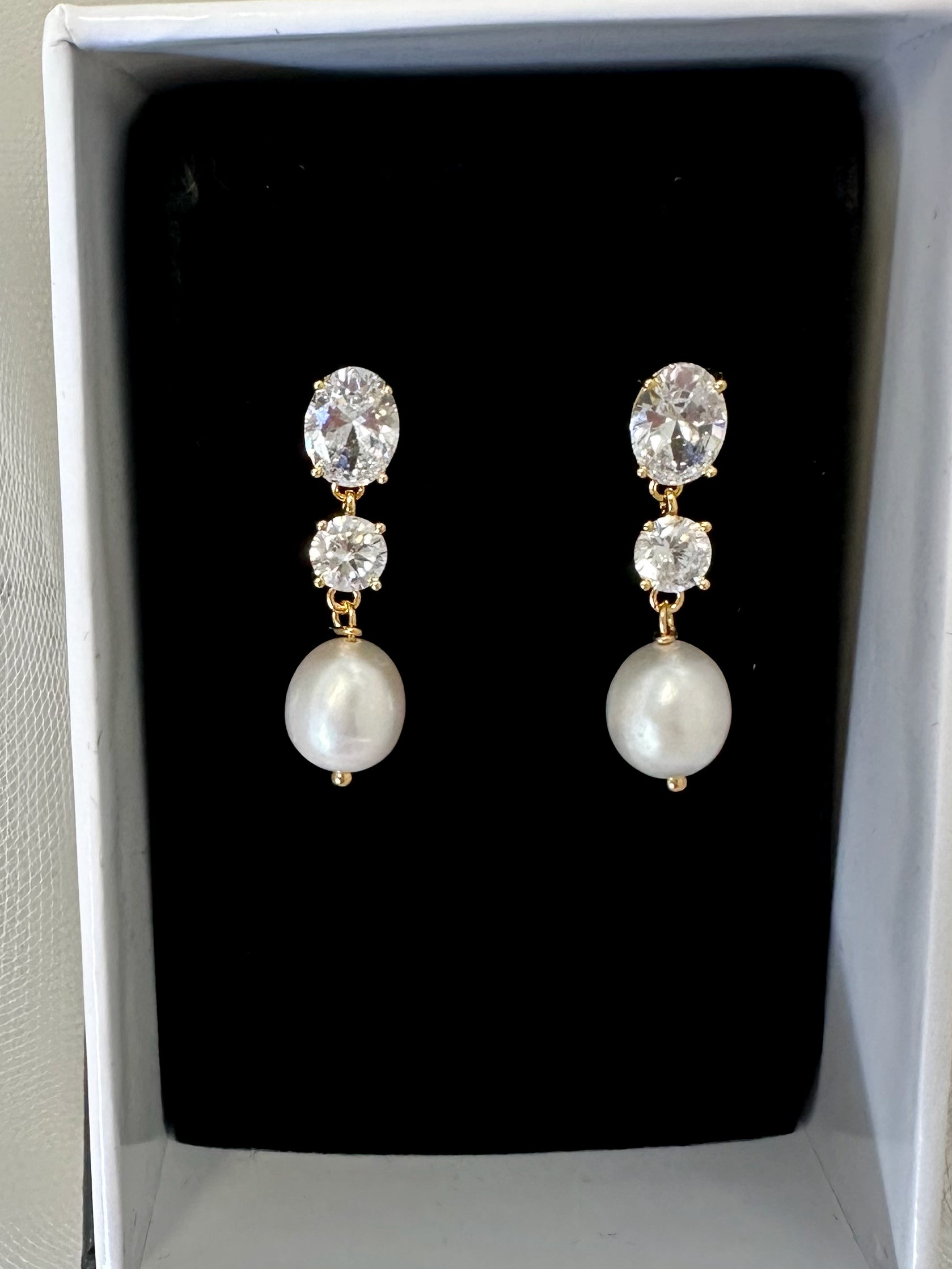 For the confident Modern Bride these real freshwater pearl earrings are perfect for the Bride of today. Two fine Crystal stones top the earring one oval and one round. The Crystal stones are open backed to allow light to dance around within the stone. In gold finish these are the earrings to walk down the aisle in. Every Bride would love these quality freshwater pearls with the beautiful cut edge crystal stones.