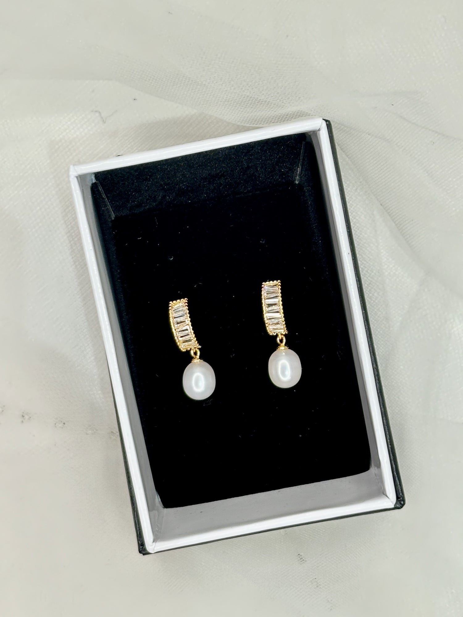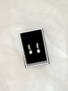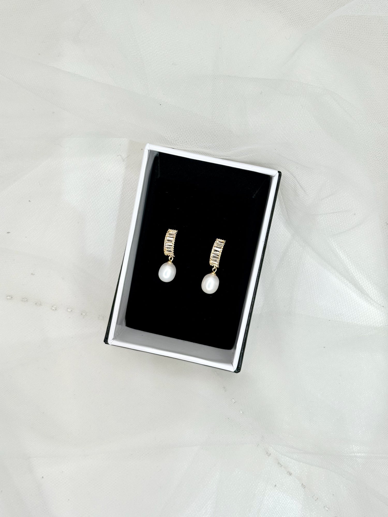 Elevate your bridal ensemble with the Ramie Earrings, featuring genuine freshwater pearls delicately paired with a crystal-studded gold-plated top. These refined earrings offer a timeless elegance, beautifully presented in a display box, making them a perfect accessory for your special day.