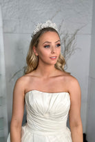 Look Stunning in this beautiful Modern Bridal Tiara, the Simona Crown is a rounded tri-peak handmade headpiece full of gleaming crystal embellishments. Fine silver leaves shine amongst the crystal clusters that adorn this crown's three main peaks, with delicate embellishments graduating to a single small peak along each side. Easily reshaped for wearing preference and comfort, Simona is the perfect piece to compliment your bridal outfit and dress you in timeless elegance. Also available with pearls custom made to order same price.