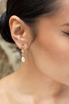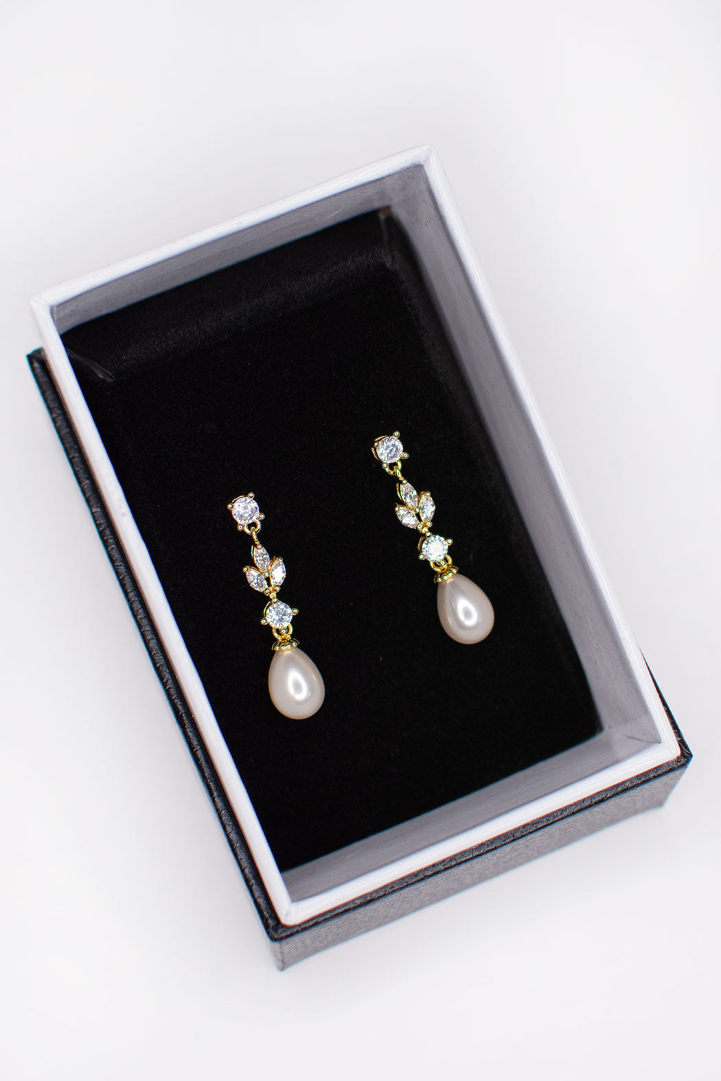 The perfect bridal earring, Tara is a stunning long drop earring made with sparkling stones and a beautifully perfect pearl drop. Tara features tiny navette crystals in the centre atop the pearl drop that both gleam and shine as you move, an earring perfect for both Brides and Bridesmaids. Delicate and detailed, Tara will dress your bridal ensemble with divinity and elegance.