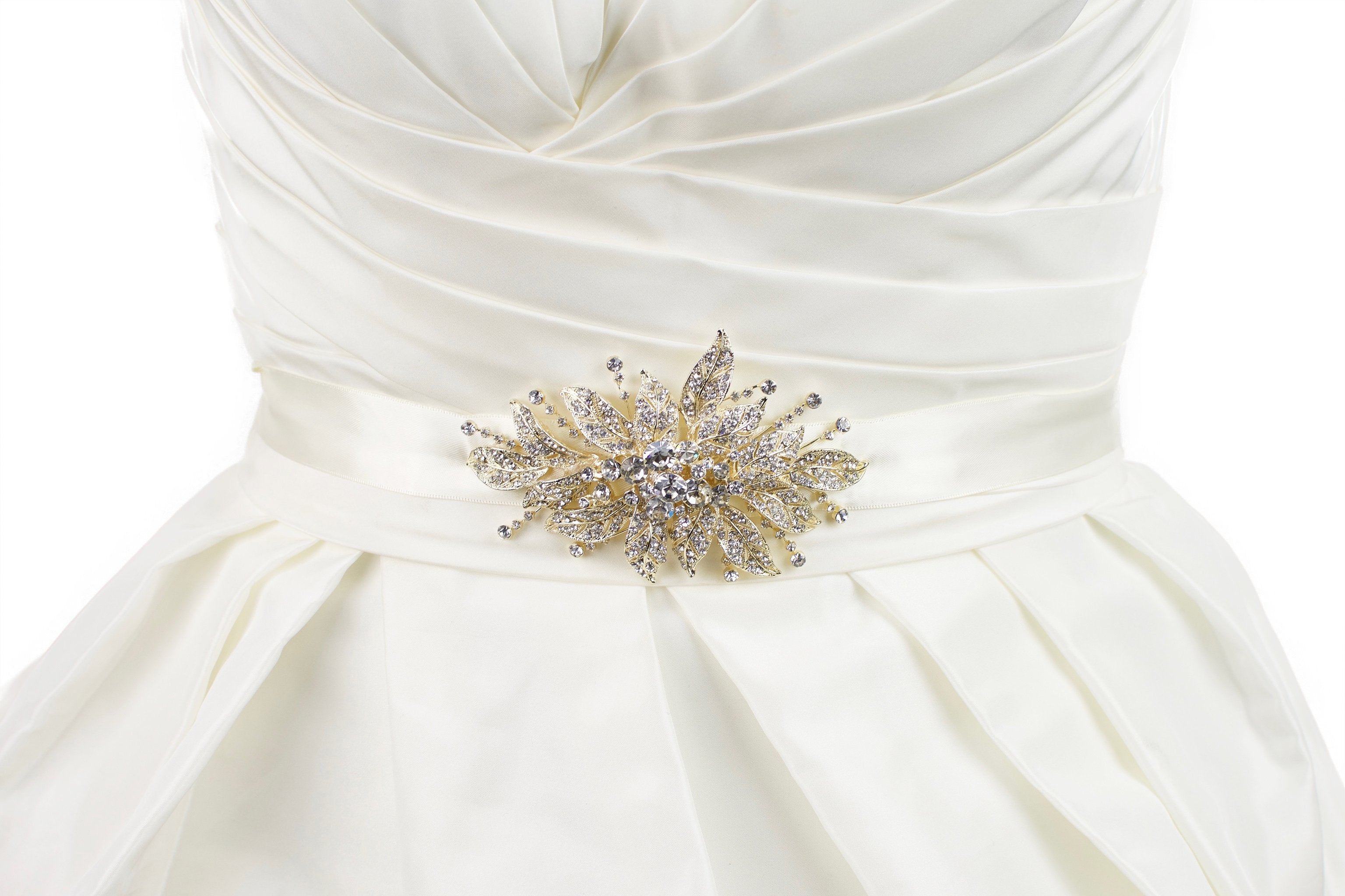A matching belt to the Viola Side Comb in Gold, the Viola Belt in Pale Gold is a beautiful sparkling flower motif belt. The motif's metal leaves are encrusted with hundreds of tiny clear stones alongside clear crystal sprigs for a gleaming and detailed floral appearance. It gives a most beautiful and unusual feature to any more simple Bridal Gown. The Viola belt is available on all our range of ribbon colours.