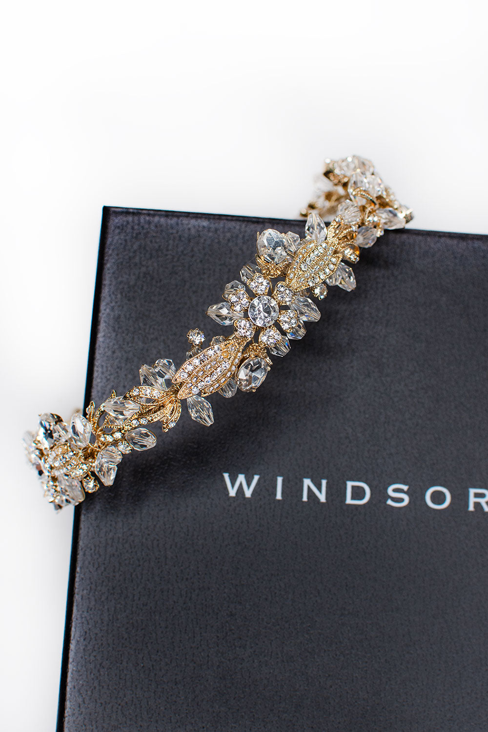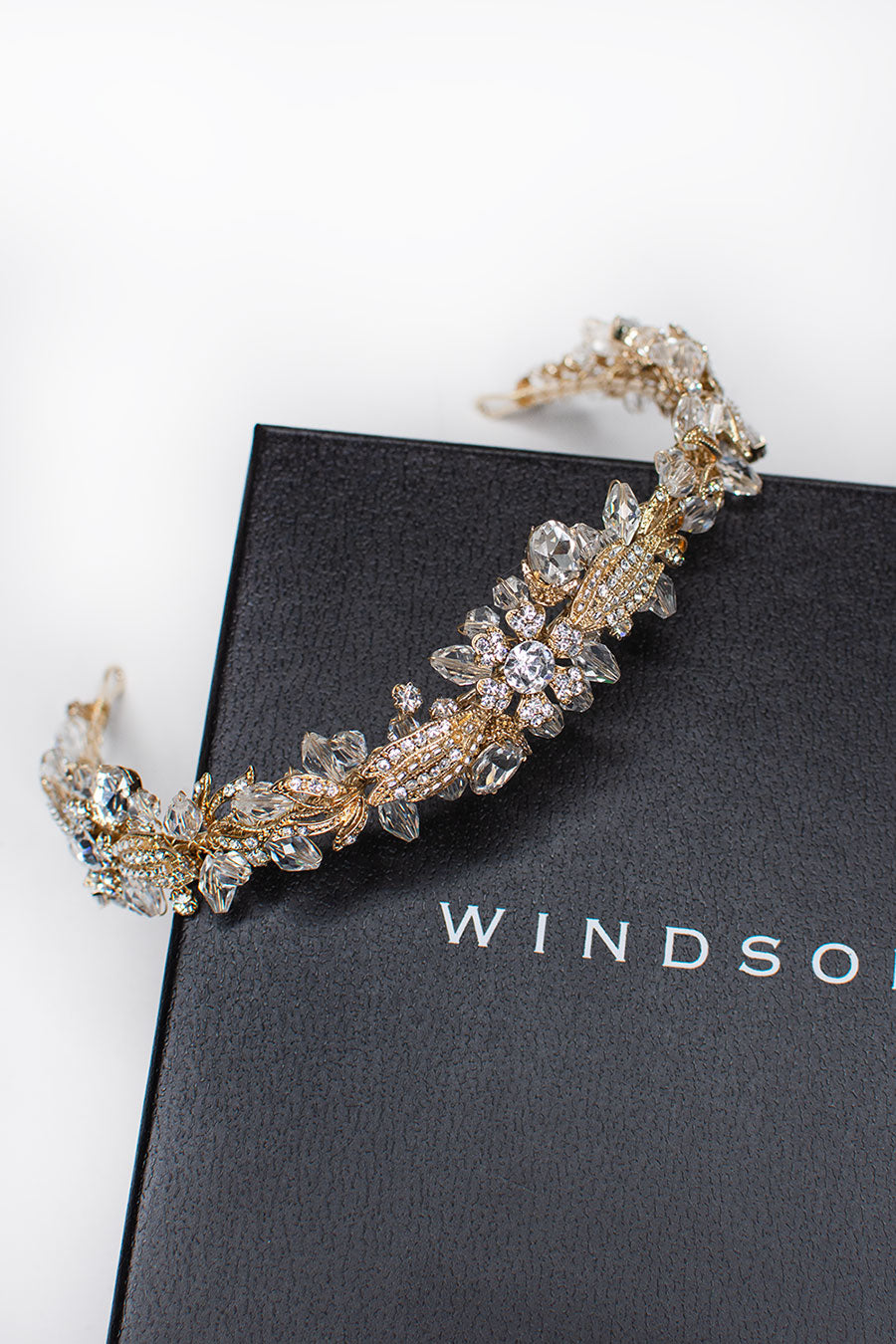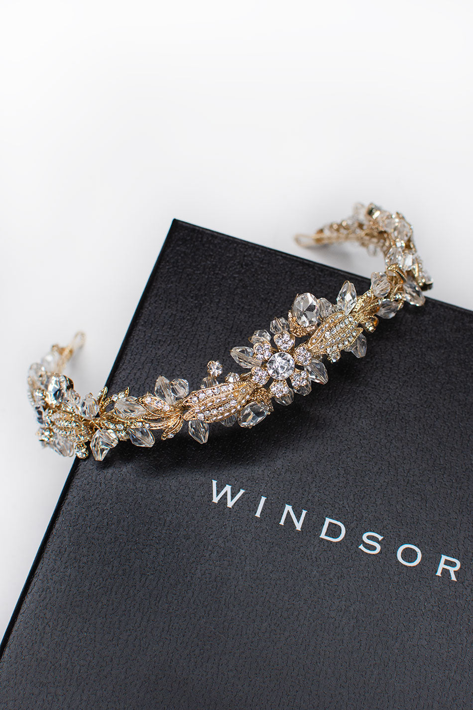 A stunning bridal headband beautifully encrusted with fine golden leaves and layers of beautiful clear crystals, Yasmin is a favourite amongst many brides. Featuring Swarovski crystal embellishments and crystal beading, this design is a refined and elegant example of bridal jewellery that pulls out all the stops. Yasmin's metal frame is bendable, allowing the headband to be easily shaped to your head for no tight pressure when wearing so that you can have a headache-free breeze of a wedding day. Yasmin is the ultimate crowning glory for the bridal look of your dreams.