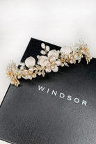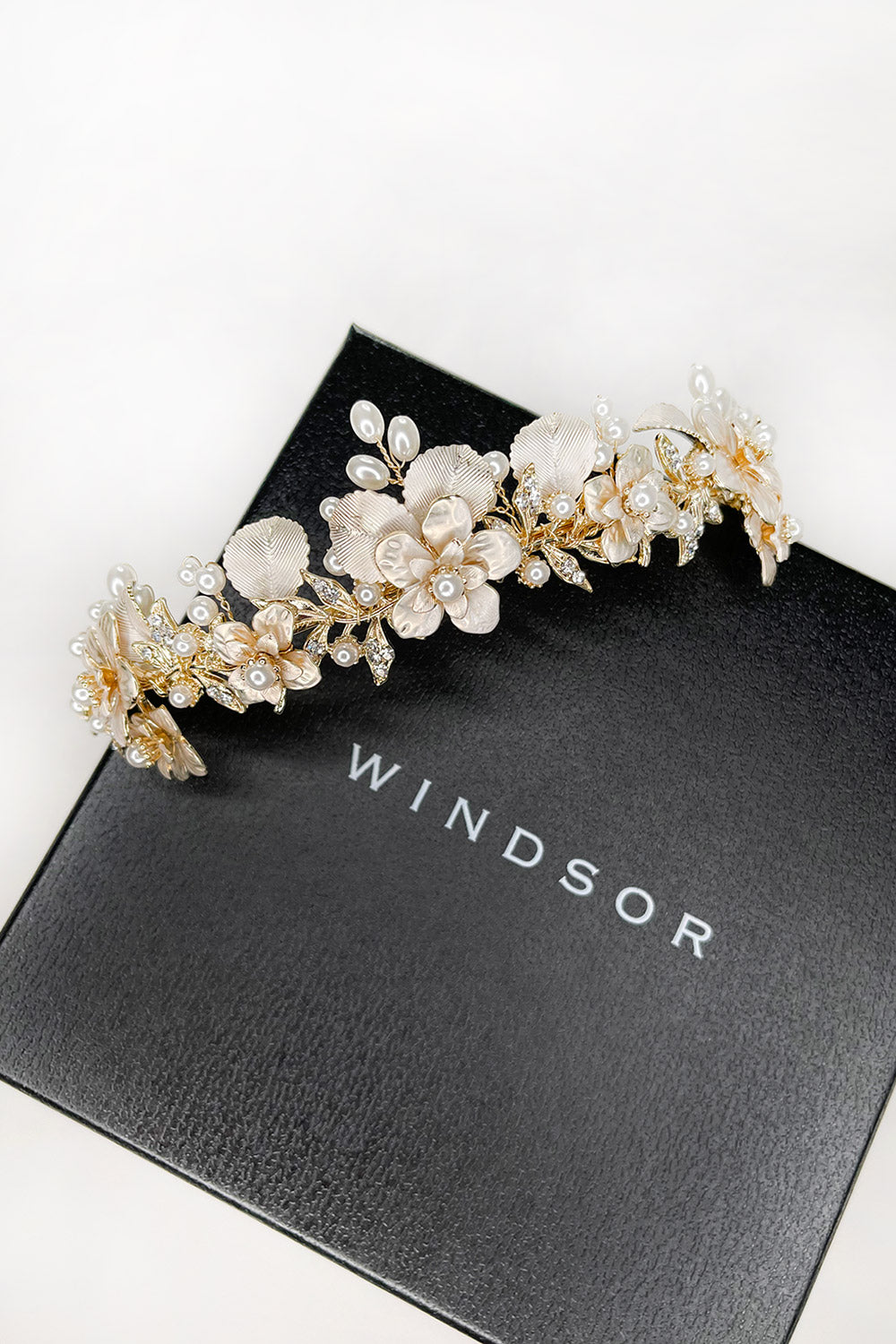 A delicate and stunning small bridal headpiece, Louise is a standout bridal tiara that is comfortable, easy to wear and is simply beautiful. Louise's flower components feature a gold pearlescent finish over the flower petals that give a soft and elegant gleam alongside the pearl sprigs, shining metal leaves and pearl embellishments that adorn the headpiece from side to side.