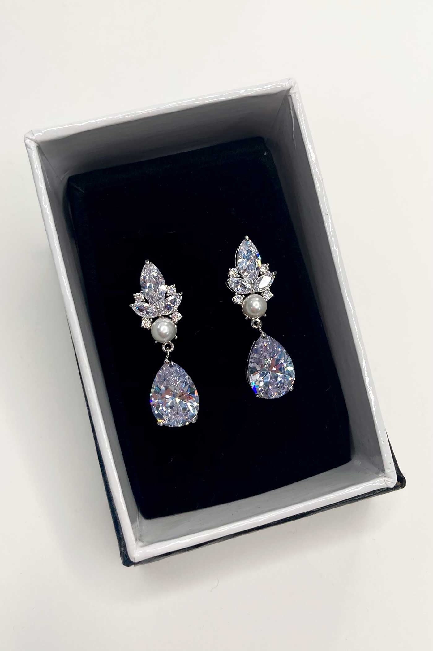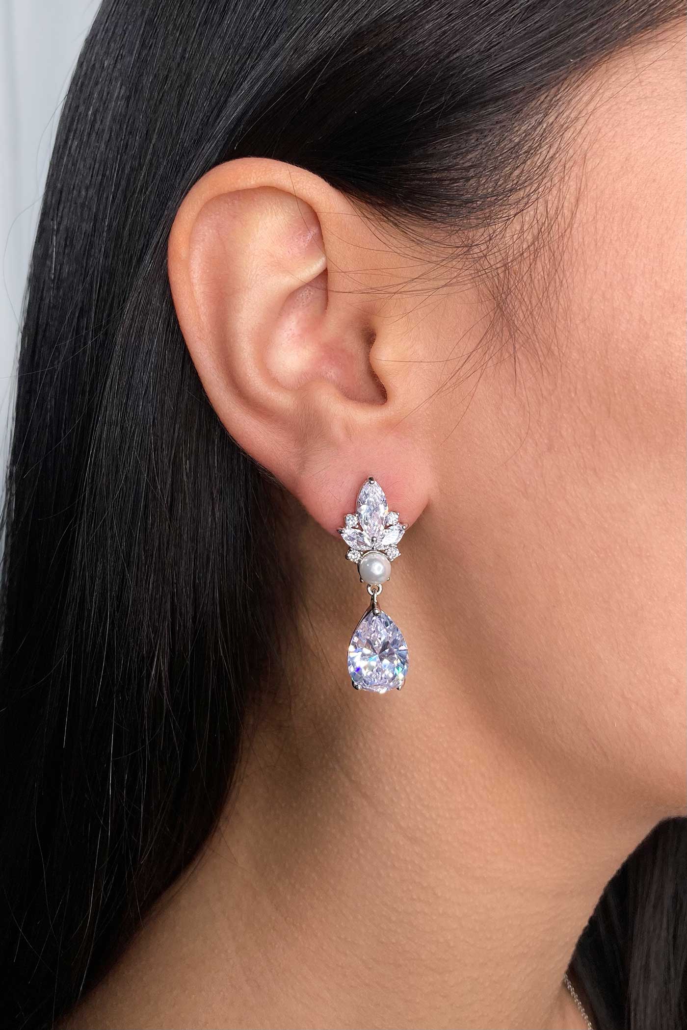 Elsa's navette crystal design is striking in both appearance and nature. Fitted inside Elsa's edgy, rigid frame rests a single gleaming, rounded Swarovski pearl. Beneath hangs a large teardrop crystal stone which splits the light and dazzles just like snow. An impeccable earring, Elsa brings a new edge to refined bridal and formal styles and is the epitome of elegance mixed with a hint of avant-garde.