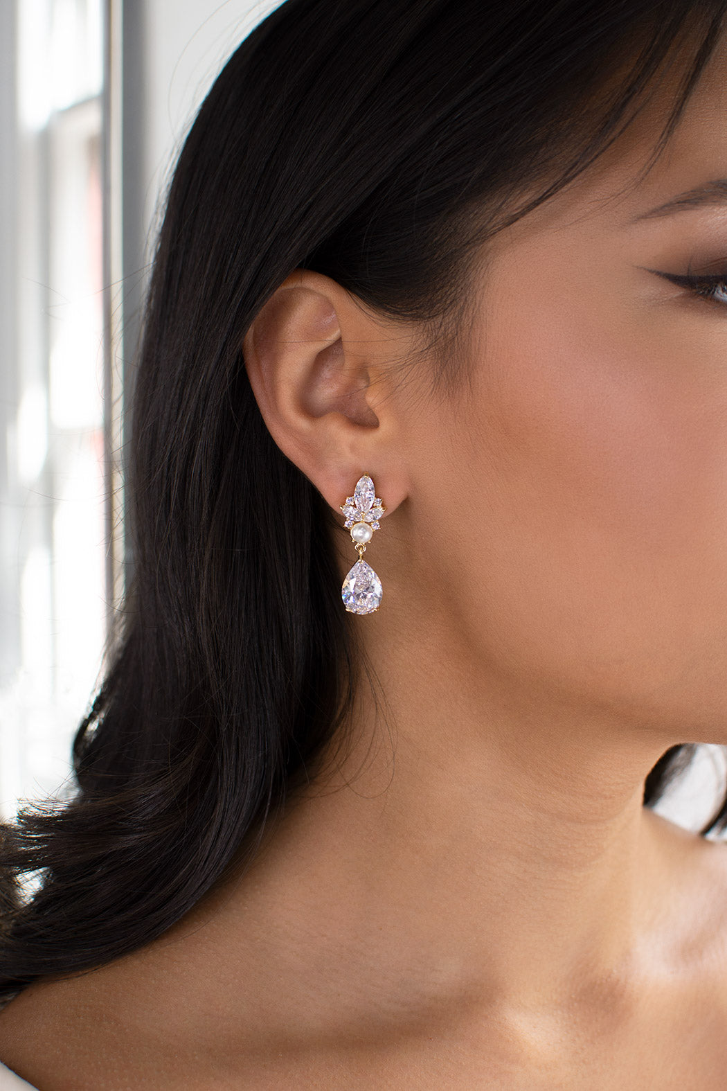 Like an icy stalagmite, Elsa's navette crystal design is striking in both appearance and nature. Fitted inside Elsa's edgy, rigid frame rests a single gleaming, rounded Swarovski pearl. Beneath hangs a large teardrop crystal stone which splits the light and dazzles just like snow. An impeccable earring, Elsa brings a new edge to refined bridal and formal styles and is the epitome of elegance mixed with a hint of avant-garde.