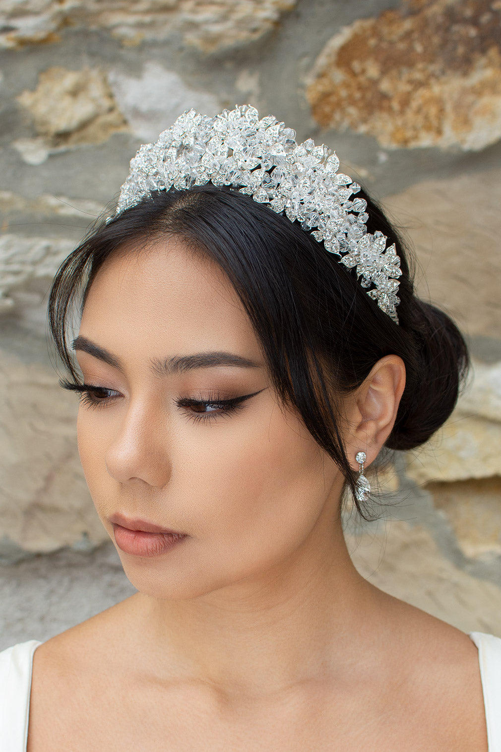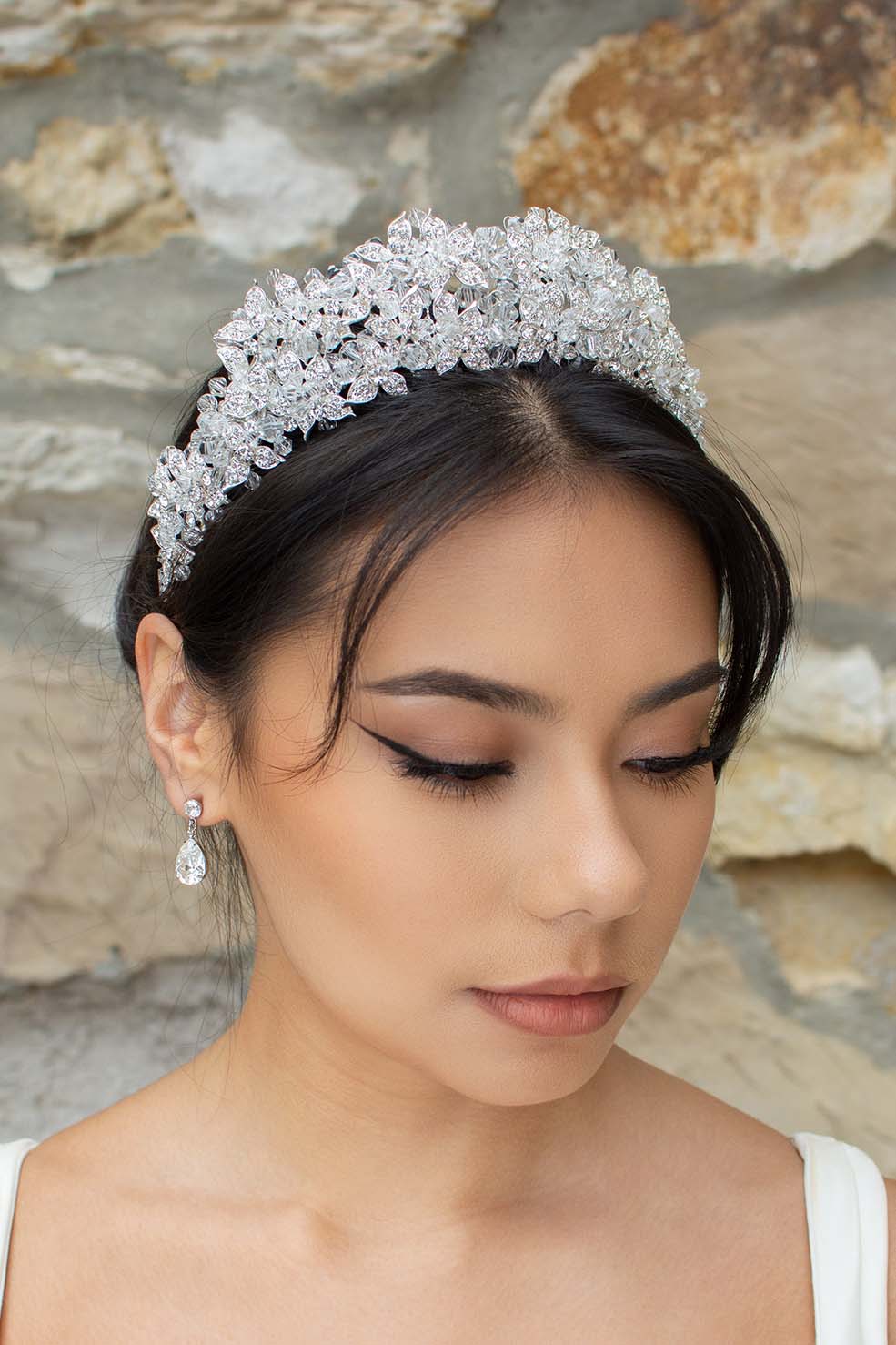 This Classic Magnificent Bridal Tiara is a dream come true featuring a symphony of shining crystal, floral details and soft silver leaves. Edwina Double is sure to be the crowning glory of your big day and make you look and feel wonderful. Edwina is easily reshaped so you can adjust the shape to suit your style because of the special headband we use to make it very comfortable to wear. A lovely and elegant bridal tiara encrusted with lovely clear crystals Edwina is all about exquisite crystal embellishment. Edwina is the good luck charm you’ll want to be wearing as you float down the aisle in front of so many happy admiring glances.
