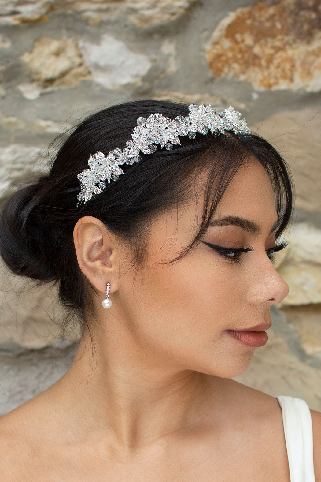 This tiara is what bridal dreams are made of featuring a symphony of crystal, floral details and bright silver leaves. Whether you choose to wear this versatile design as a traditional tiara or a bridal headband, it is sure to be the crowning glory of your big day and make you look and feel wonderful. Edwina is easily reshaped so you can adjust the shape to suit your style because of the special headband we use to make it very comfortable to wear. A magnificent bridal headband or low-rise bridal tiara encrusted with lovely clear crystals. Edwina is all about exquisite crystal embellishment. Edwina is the good luck charm you’ll want to be wearing on your way down the aisle.