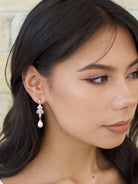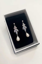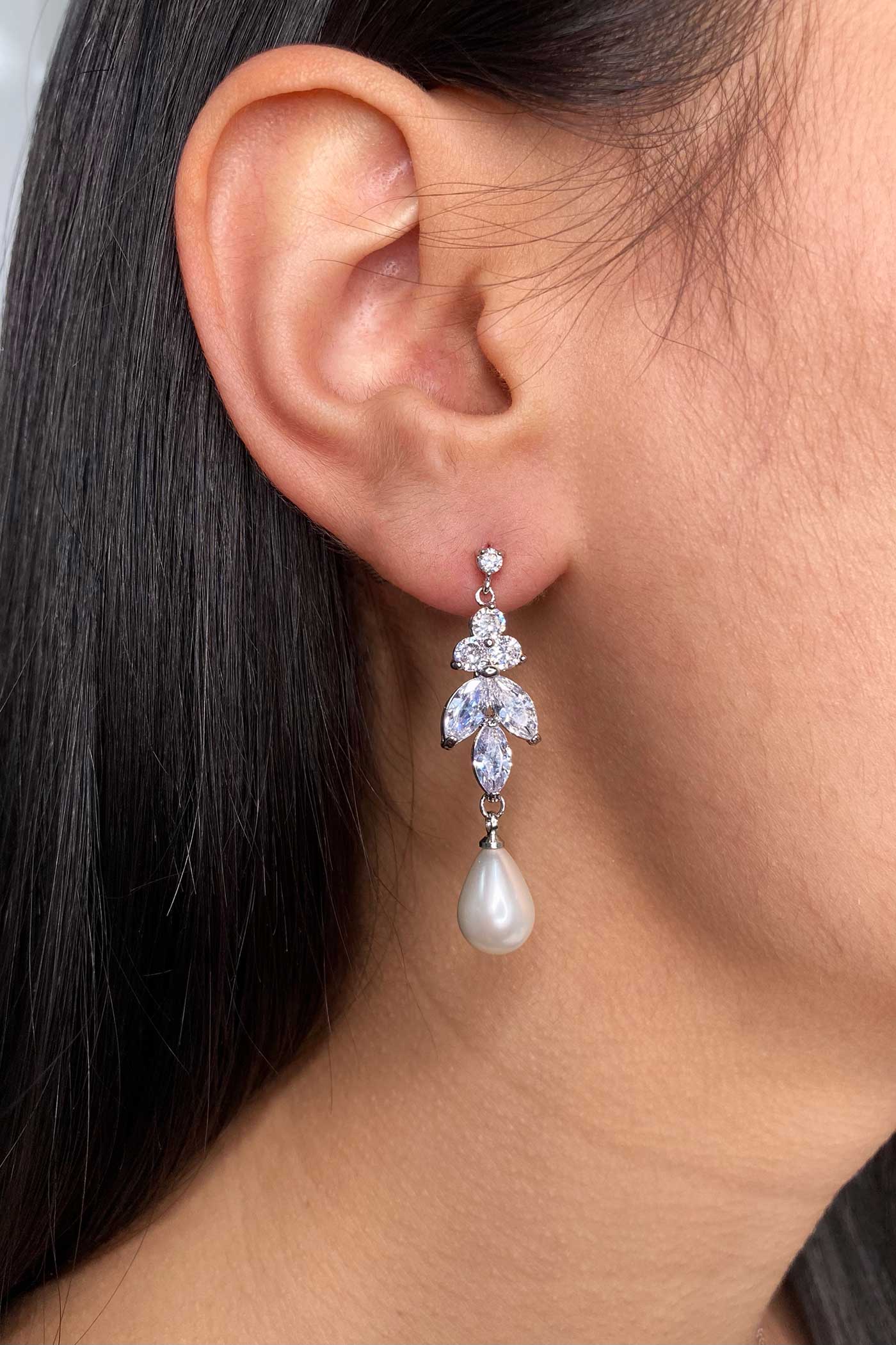 A gorgeous art deco style earring, Remy features a gleaming crystal arrangement made from circular and navette-shaped crystals above a single beautiful teardrop Swarovski pearl, designed to move and dance with as much grace as the bride who wears it. A showstopper of an earring, Remy is the perfect compliment for any bridal or formal ensemble.