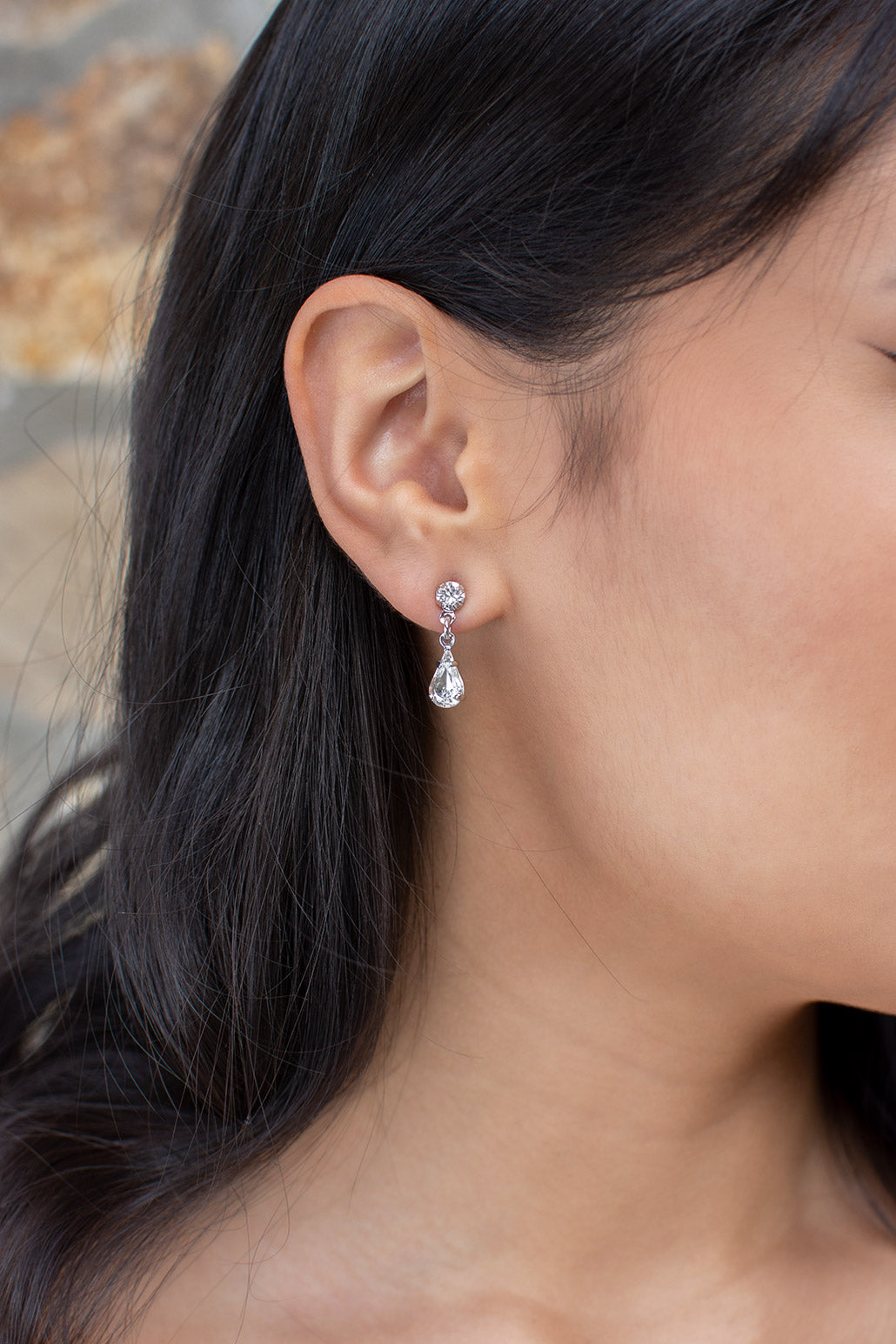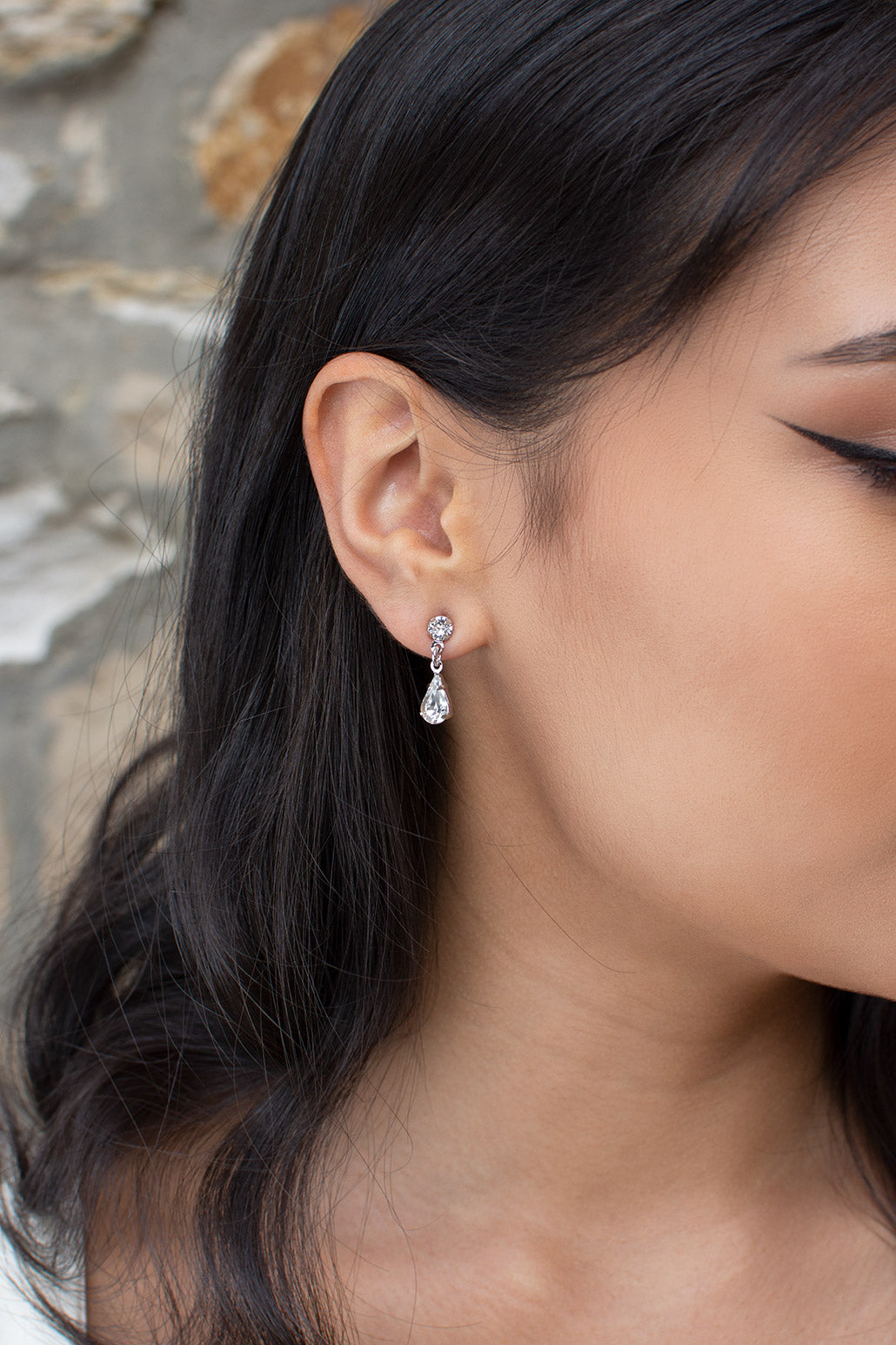 An effortlessly elegant pair of Swarovski teardrop earrings, Lara will be gleaming in the sunlight as you walk down the aisle. A classic yet simply stunning set of earrings, Lara's fine Swarovski teardrop stone is claw set by hand into a quality lasting Silver plated cup, hanging beneath a single circular crystal stud. Lara is complete with Titanium Alloy post fittings and is the perfect bridal earring for a simple touch of quality and beauty, suitable for brides and bridesmaids alike.