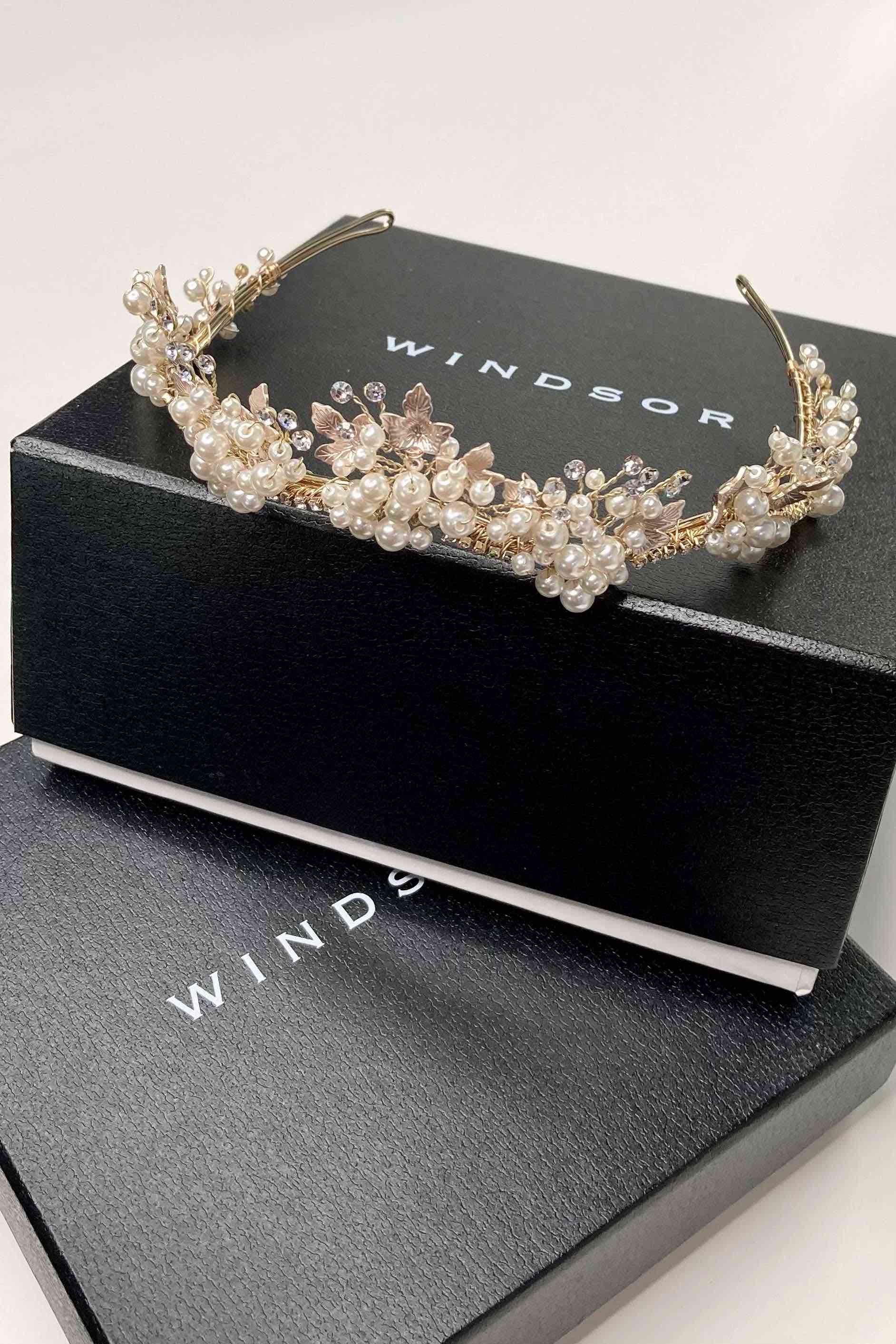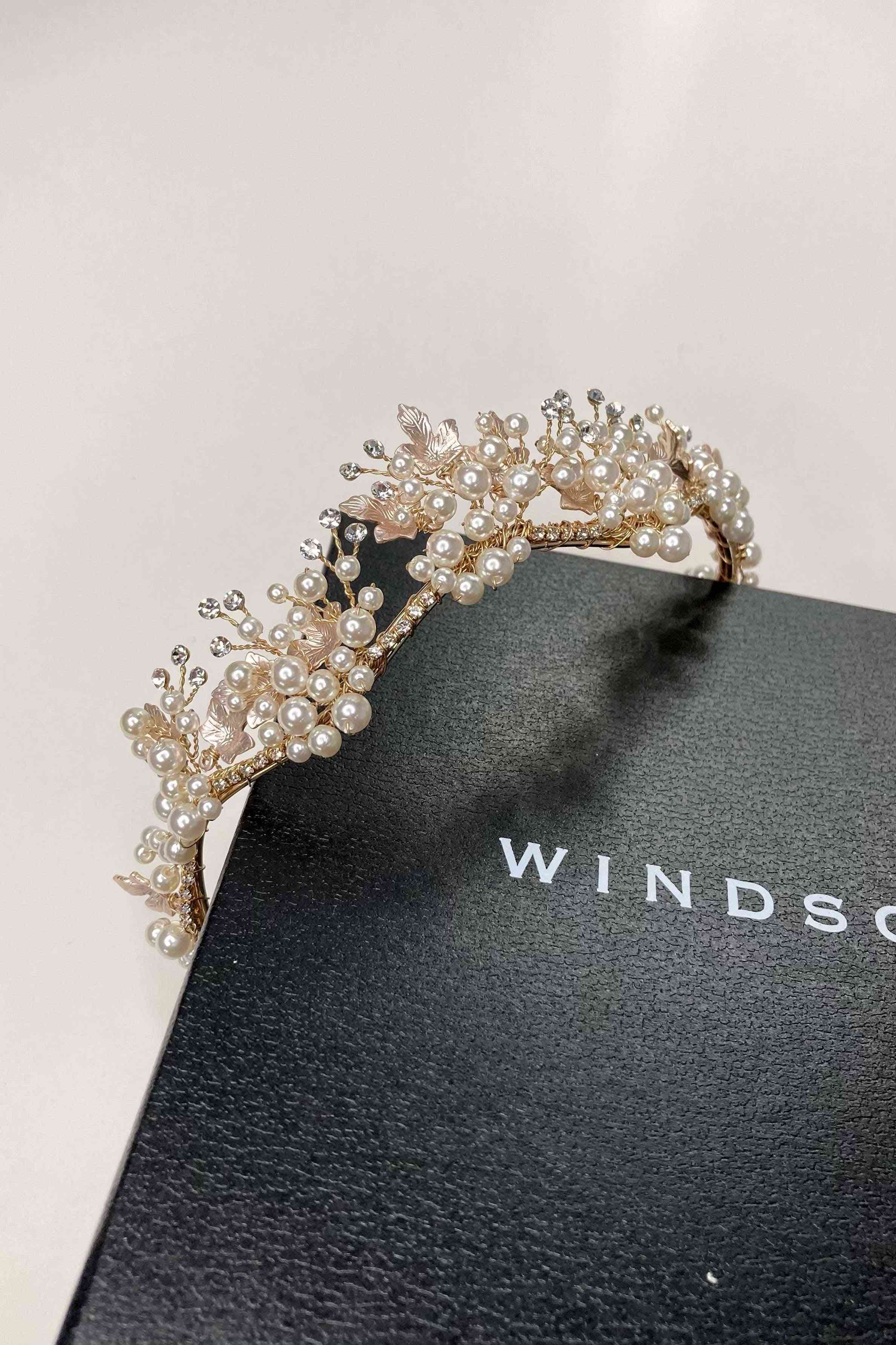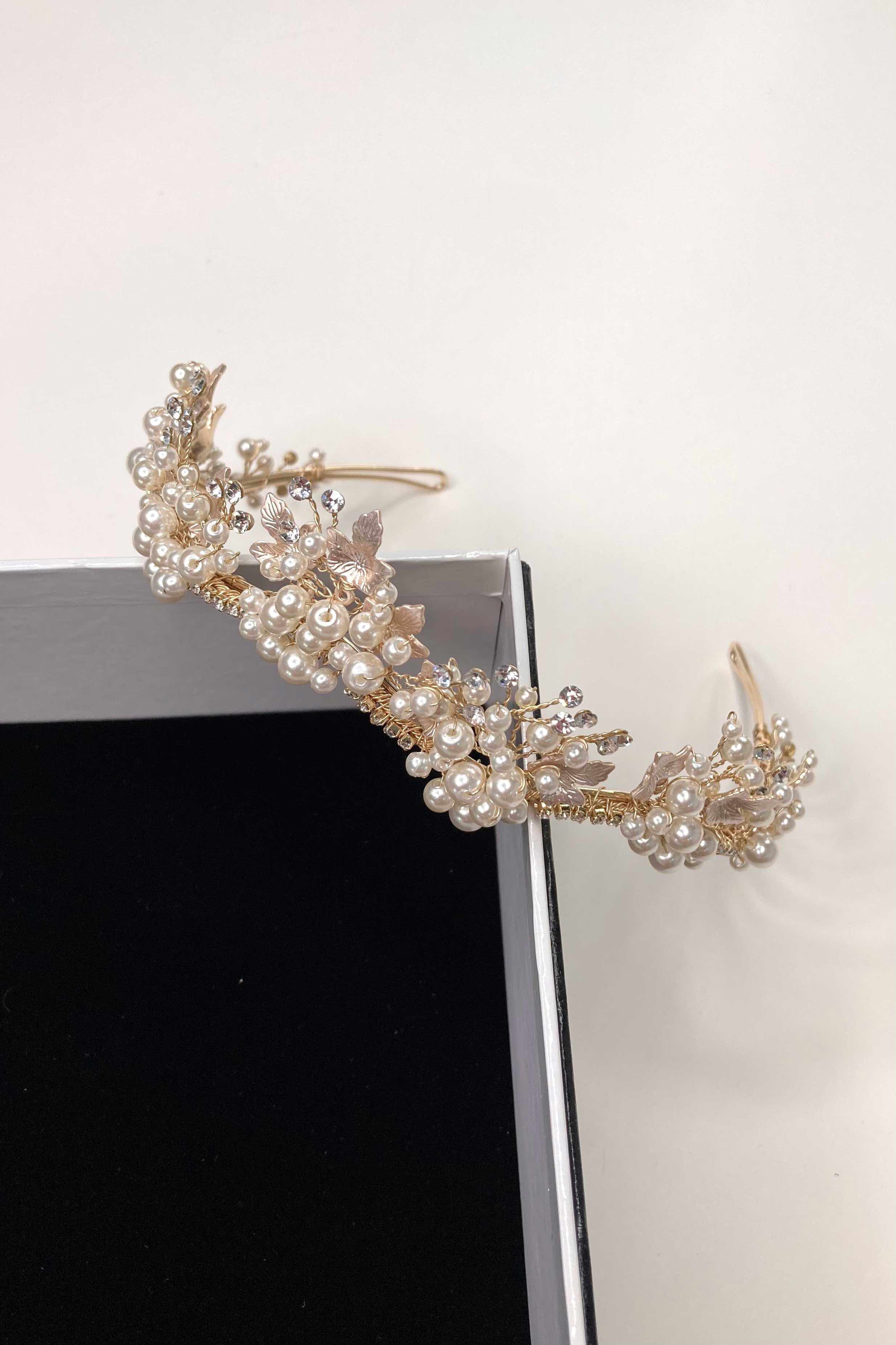 With glistening sprigs of pearl and a touch of crystal, Anita is a beautiful five-point tiara that will adorn your head with classical elegance. With an abundance of extra pearls in the Gold variation, Anita's leafy pearl design pairs perfectly with a modern dress or an elegant up-do hairstyle; An elegant minimal tiara for the modern bride. The metal frame of the Anita is complete with small crystals and pearls adoring the entire front of the tiara. The frame itself is bendable, allowing for the crown to be easily shaped to your head with no tight pressure when wearing so that you can have a headache-free breeze of a wedding day