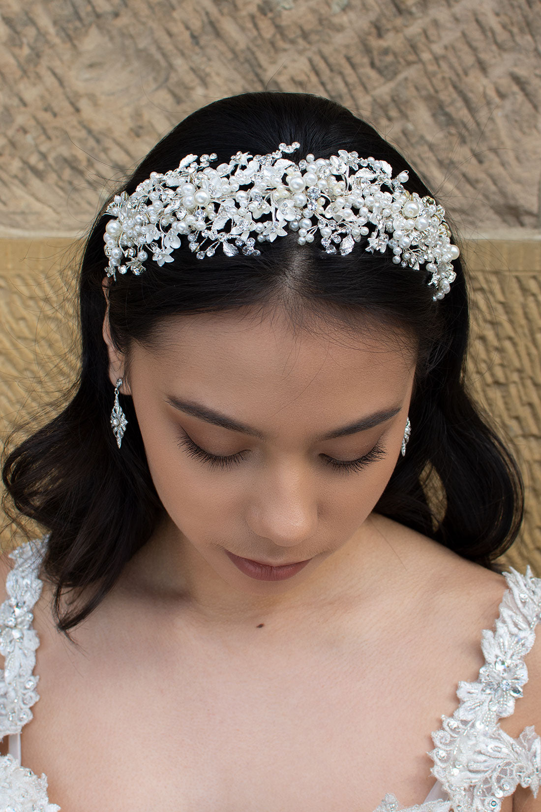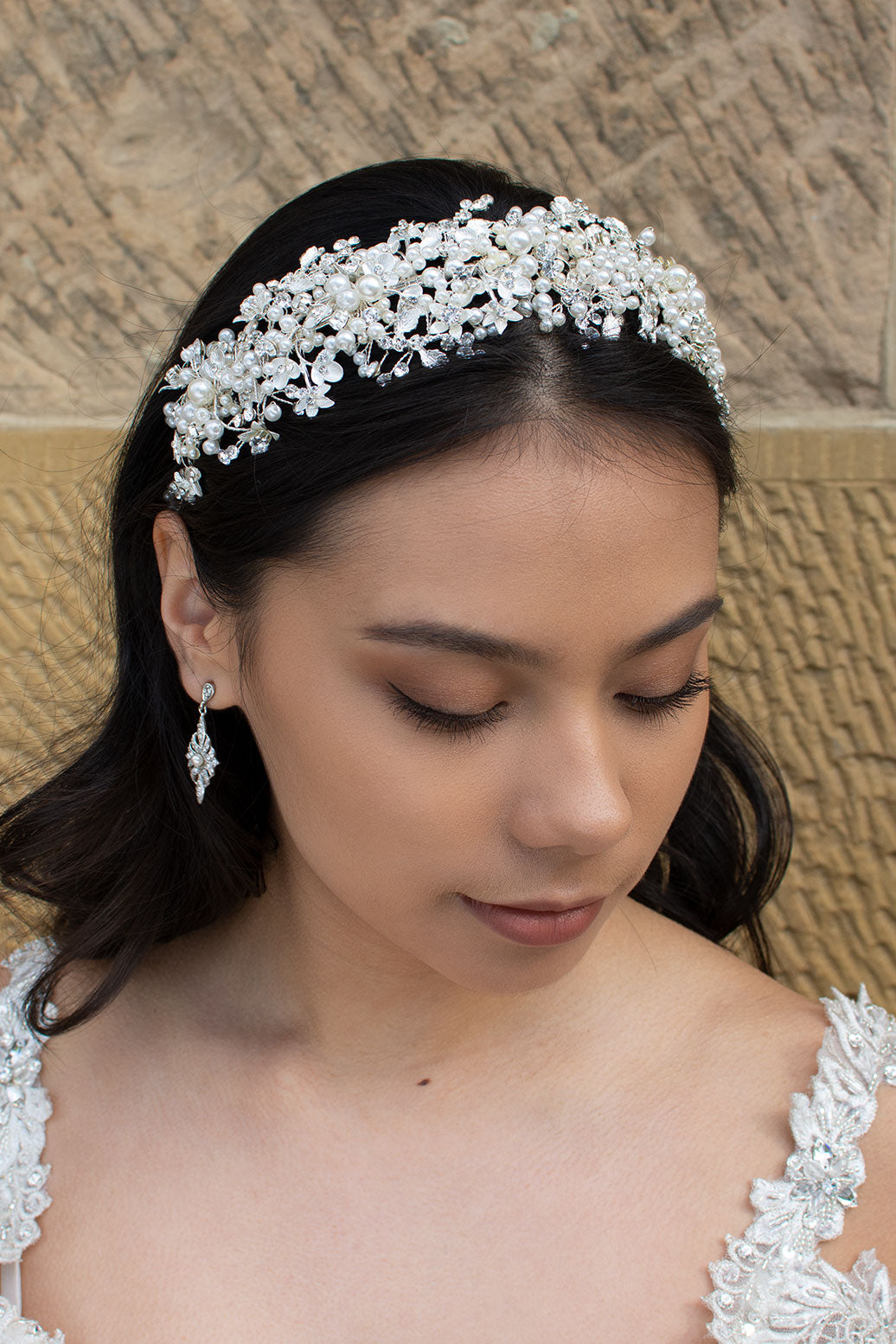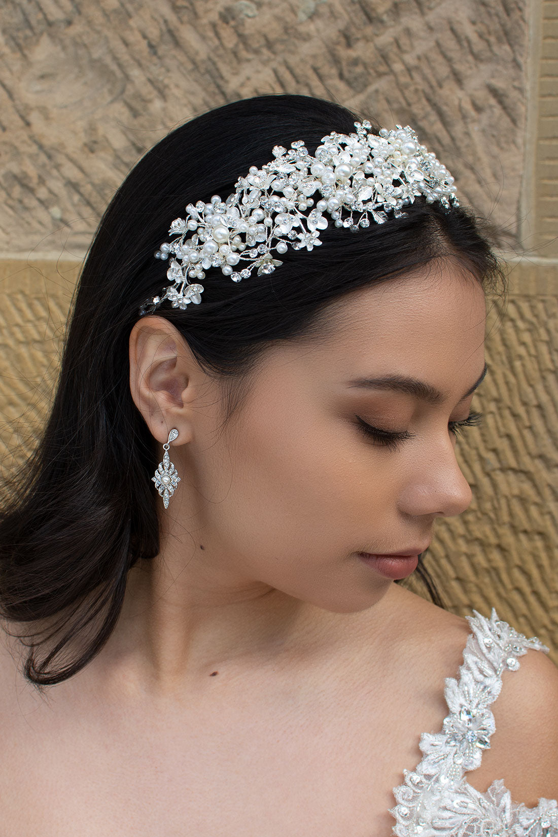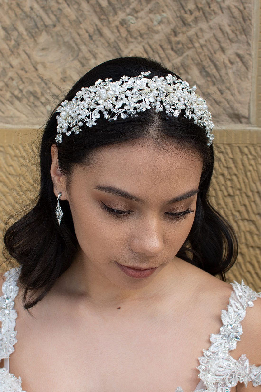Our beautiful Elizabeth headband is a wide-set design featuring an angelic array of crystals, pearls and silver pearlescent motifs. Elizabeth is an ornate wide headband that arches over your head with hundreds of diverse pearls. Twisted among the branches of soft silver peep out small circular crystals, some encased by silver pearlescent floral motifs. Elizabeth is a truly angelic pearl headband which follows an organic form. Elizabeth is soft and flexible and can be easily moulded to the shape of your head without pressure.
