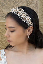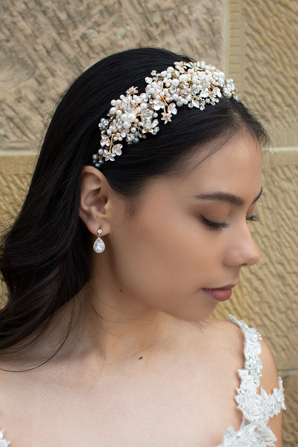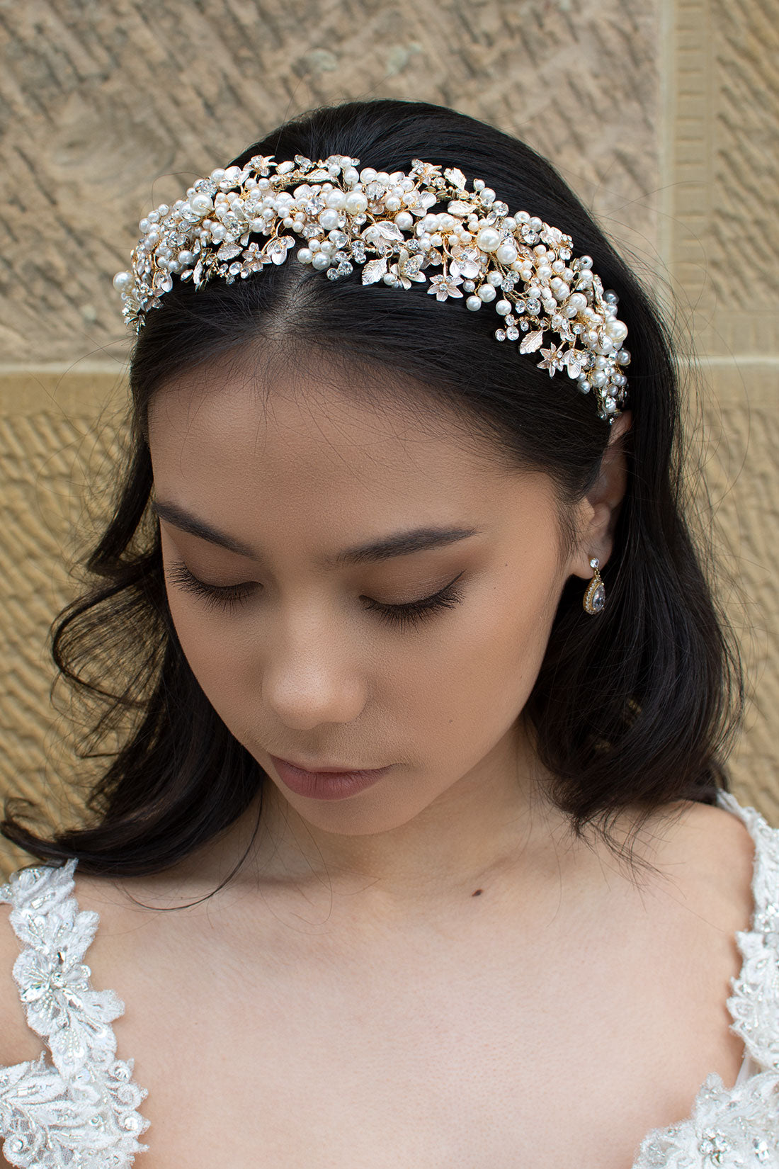 Our beautiful Elizabeth headband is a wide-set design featuring an angelic array of crystals, pearls and gold pearlescent motifs. Elizabeth is an ornate wide headband that arches over your head with hundreds of diverse pearls. Twisted among the branches of pale gold peep out small circular crystals, some encased by gold pearlescent floral motifs. Elizabeth is a truly angelic pearl headband which follows an organic form. Elizabeth is soft and flexible and can be easily moulded to the shape of your head without pressure.