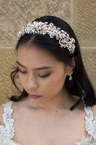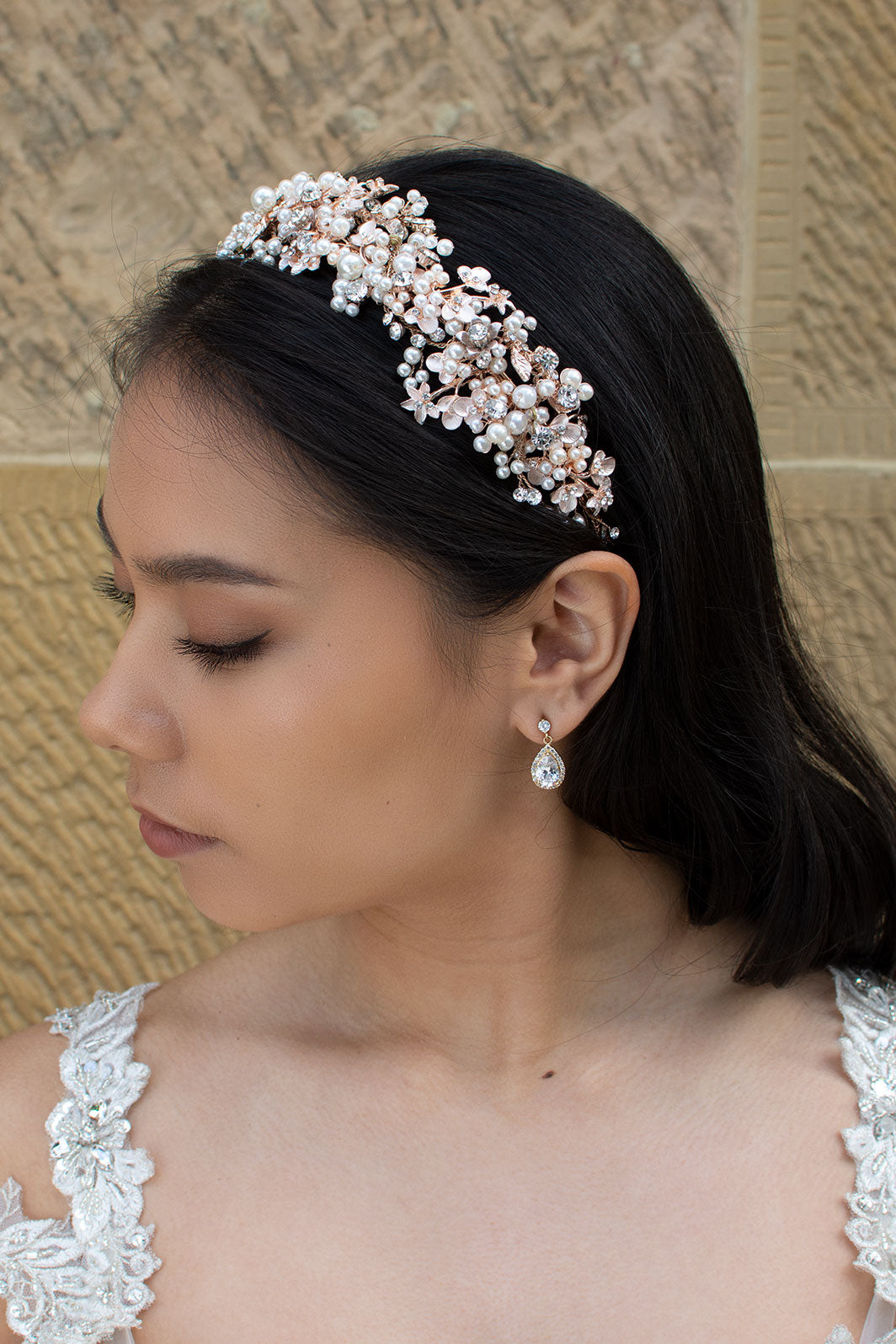 Our beautiful Elizabeth headband is a wide-set design featuring an angelic array of crystals, pearls and rose gold pearlescent motifs. Elizabeth is an ornate wide headband that arches over your head with hundreds of diverse pearls. Twisted among the branches of pale rose gold peep out small circular crystals, some encased by rose gold pearlescent floral motifs. Elizabeth is a truly angelic pearl headband which follows an organic form. Elizabeth is soft and flexible and can be easily moulded to the shape of your head without pressure.