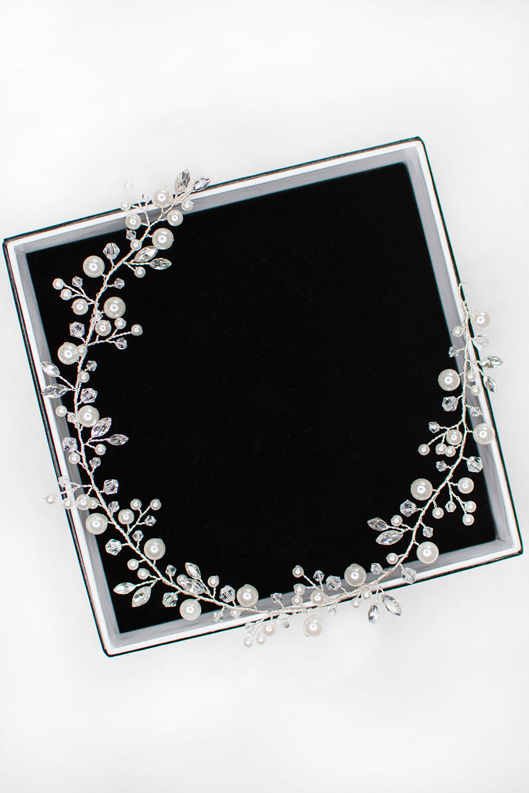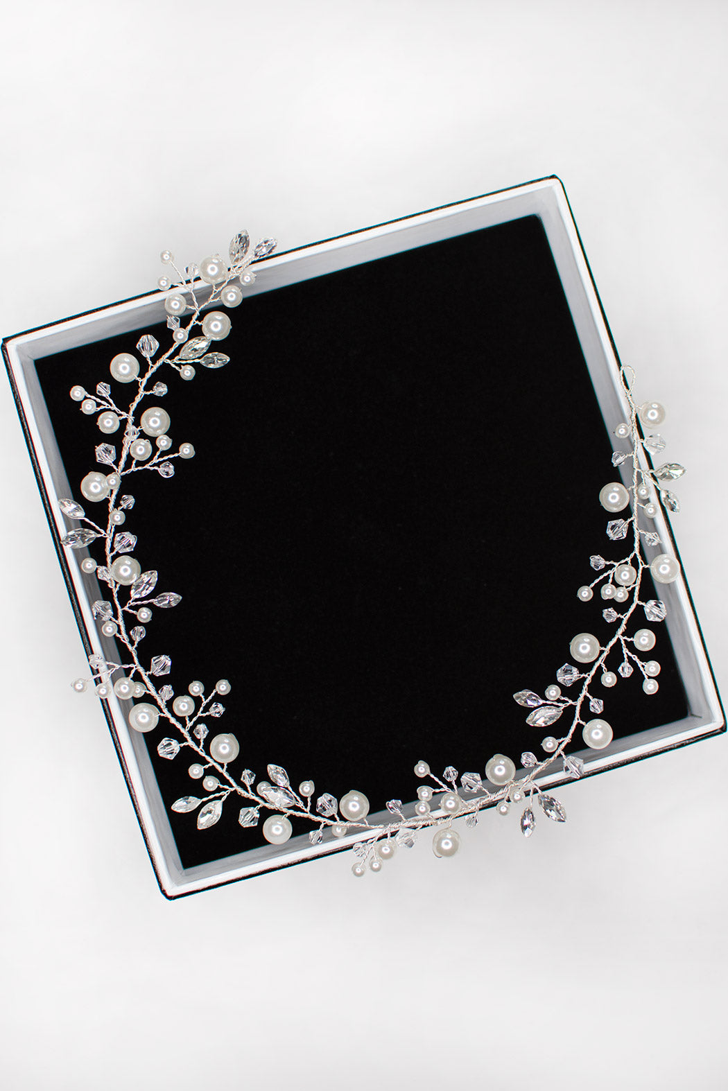 Gia is a beautiful minimal crystal bridal vine. Pearl beads and crystal stones of varying sizes and shapes glisten and glint as they adorn Gia's super soft flexible metal wire base, making it easy for you to wind Gia around up-do's and intertwine in hairstyles. The possibilities are endless with Gia, and is sure to add a little sparkle and beauty to your bridal ensemble.