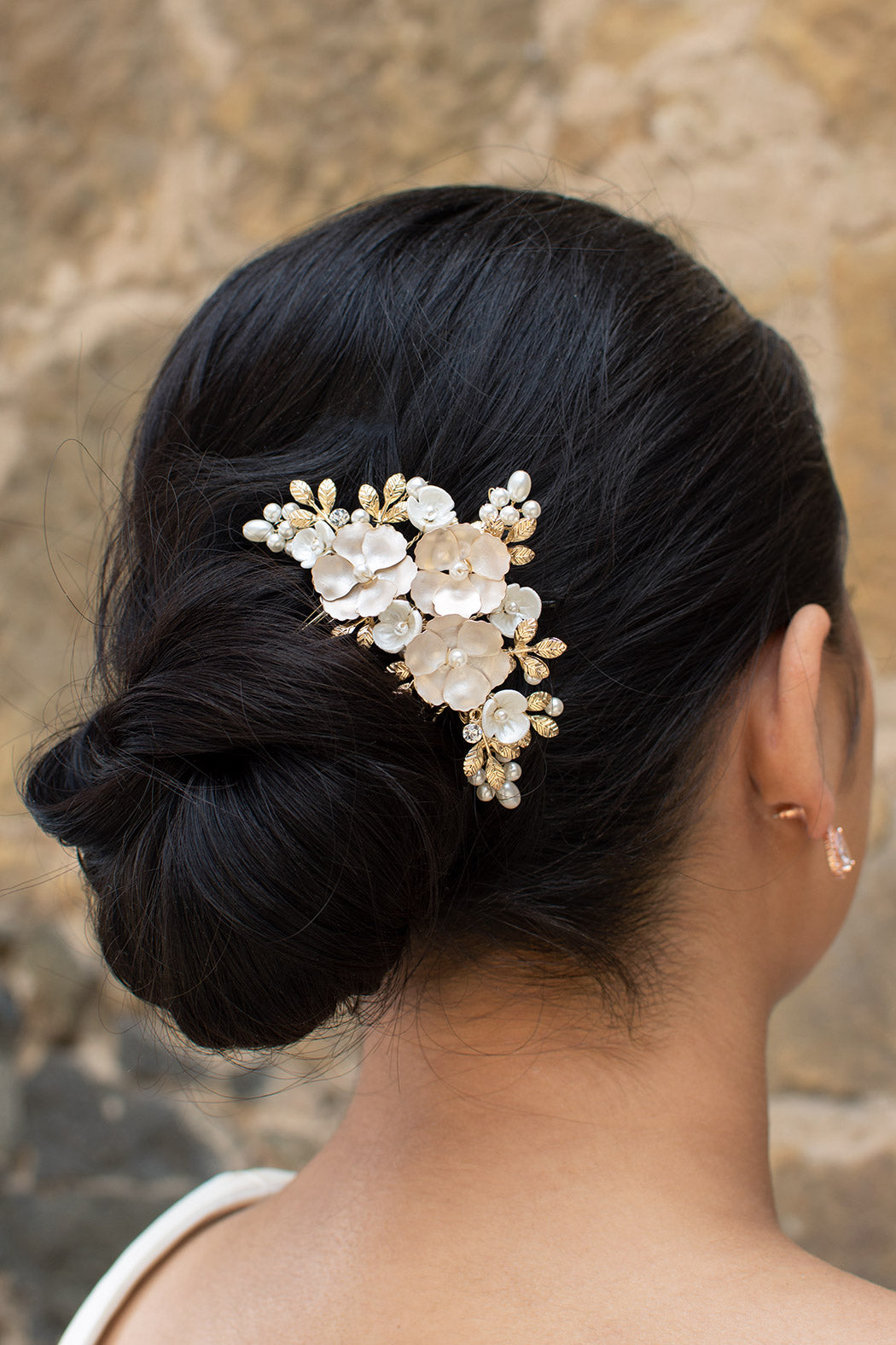 A beautiful budding beauty, Iris is a small yet stunningly detailed headpiece. Complete with a comb fitting, Iris features three delicate metal flowers hand-painted with a pearlescent gold finish coupled with an array of gorgeous pearls. Similar to our Ava Side Comb, Iris is a downsized version and is perfect for brides, bridesmaids and flower girls alike.