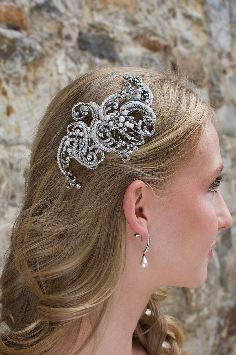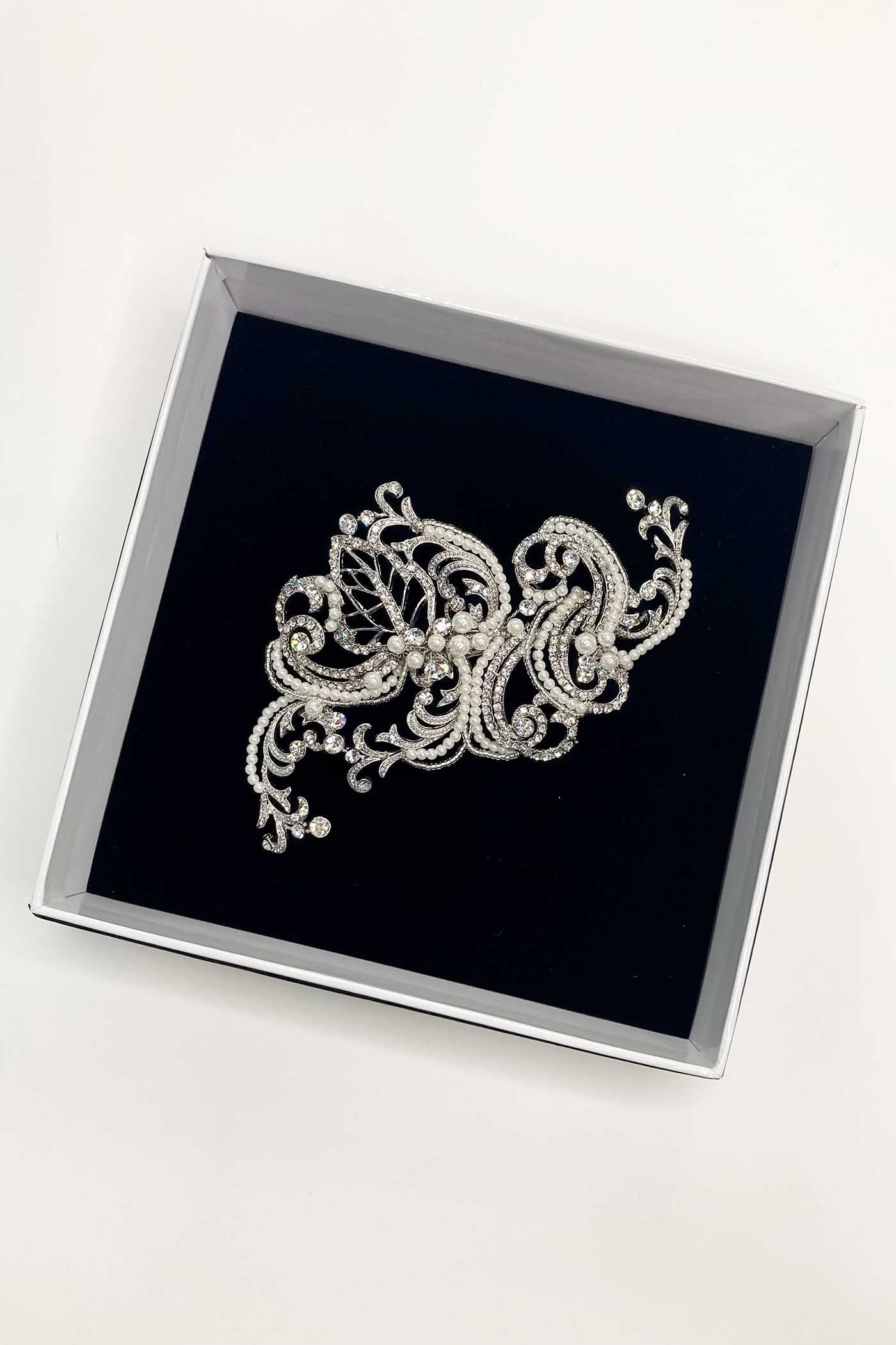 Jade’s swirling details are simply stunning in rhodium (dark silver), with all elements of this piece elegantly embellished with pearls or encrusted with crystals. Lightweight and fitted with a strong clip to secure it, you’ll be looking Art Deco divine wearing Jade on your special day.