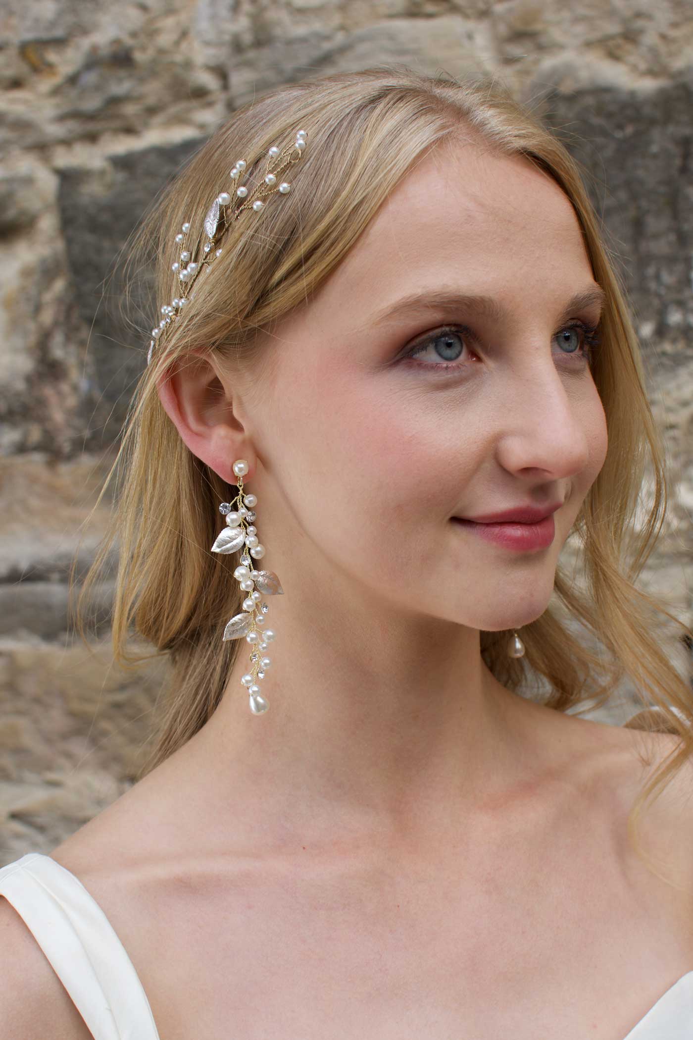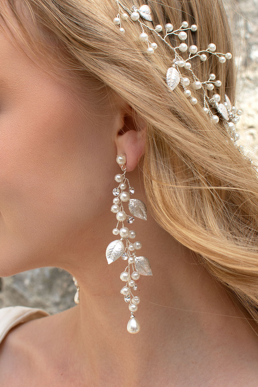Juliet, a divine stream of pearls bound by silver wire, gracefully falls in a long outstretched manner with touches of polished silver leaves and sprigs of rounded crystal. Ultra light and flexible, Juliet is a romantic vine style of earring. Juliet is approximately 11cm long and 2cm wide and weighs only 4 grams each. Juliet is the matching earring for our Magnolia Vine in Silver