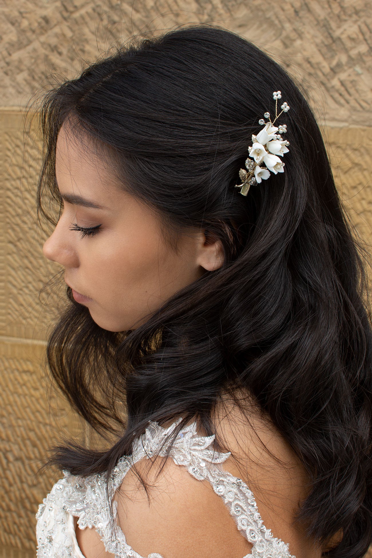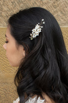 Millie is super easy to wear and versatile, she can be worn in almost any hairstyle. This mini sized side clip is perfect for a Bride looking for a hint of gold in her hair or a brilliant matching piece for each of your brides maids. Millie has it all- small gold leaves, hints of crystal, ceramic flower and small branches of pearls. Millie is perfect for all weddings and styles, a perfect all rounder side clip!
