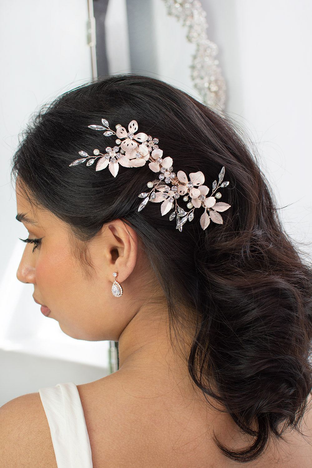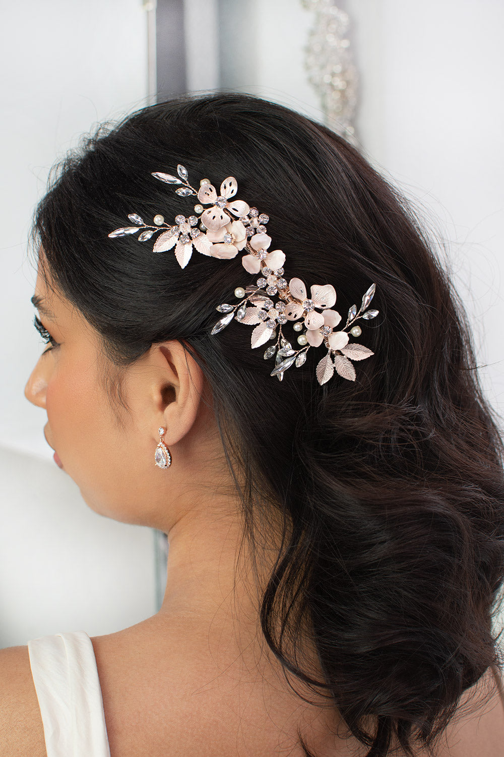 An ethereal side comb, Bianca is perfect for a look with refined elegance. An array of delicate metal leaves and petals with a pearlescent finish extend from the base and decorate the head alongside gleaming crystal sprigs. Bianca is easily adjustable for styling preference and is fitted with a secure clip at the back for a strong and comfortable wear. If you are looking for a hint of sparkle and glamour, Bianca is the perfect choice.