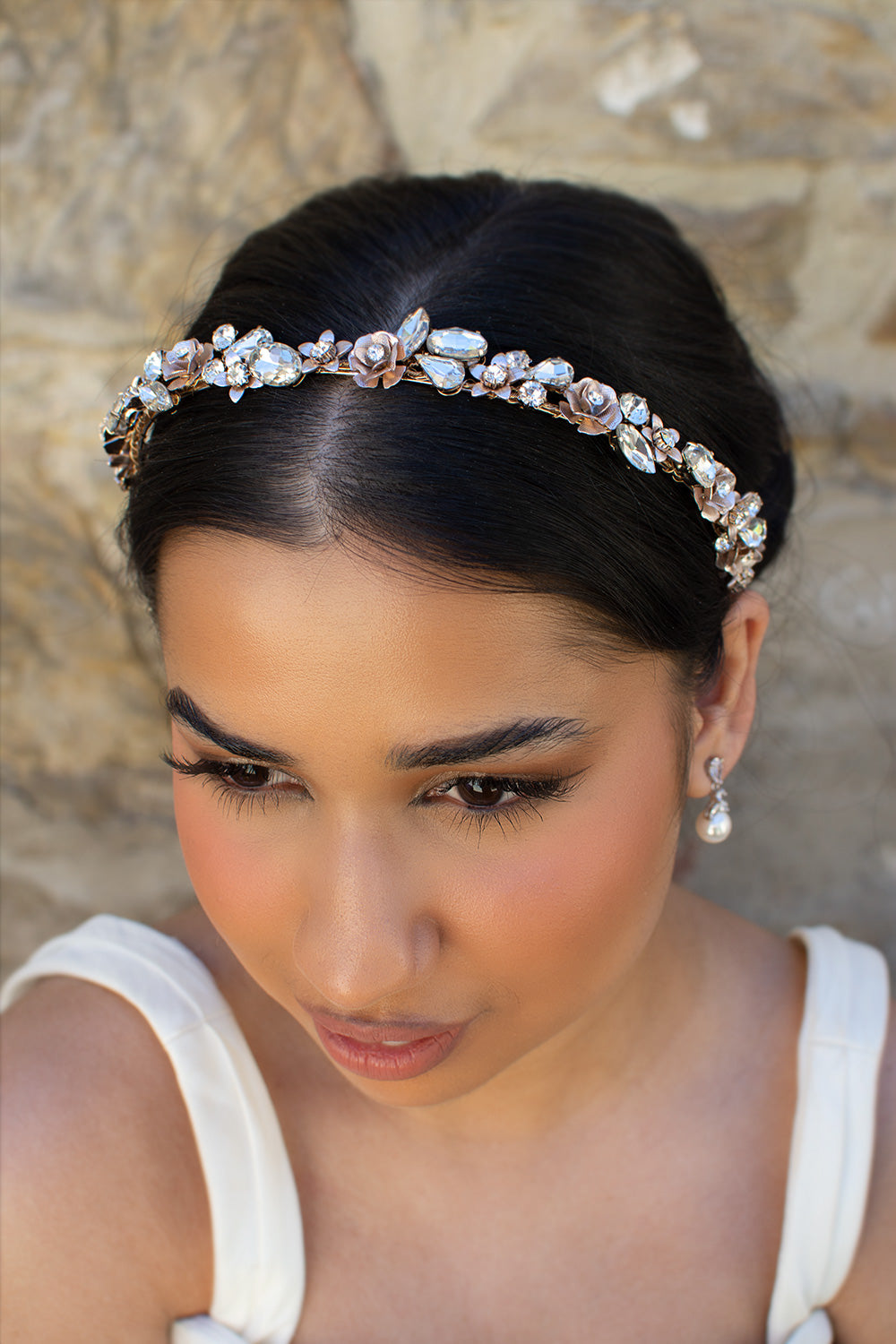 Greta is the essence of simple sophistication. This piece is the final fairy-tale touch to complete your bridal look if you have been looking for a narrow bridal headband style. It features a unique ensemble of Swarovski stones and embellished rose gold floral details. Greta is so easy to adjust for individual wearing preference and comfort that you won’t want to take this tiara off at the end of the day.