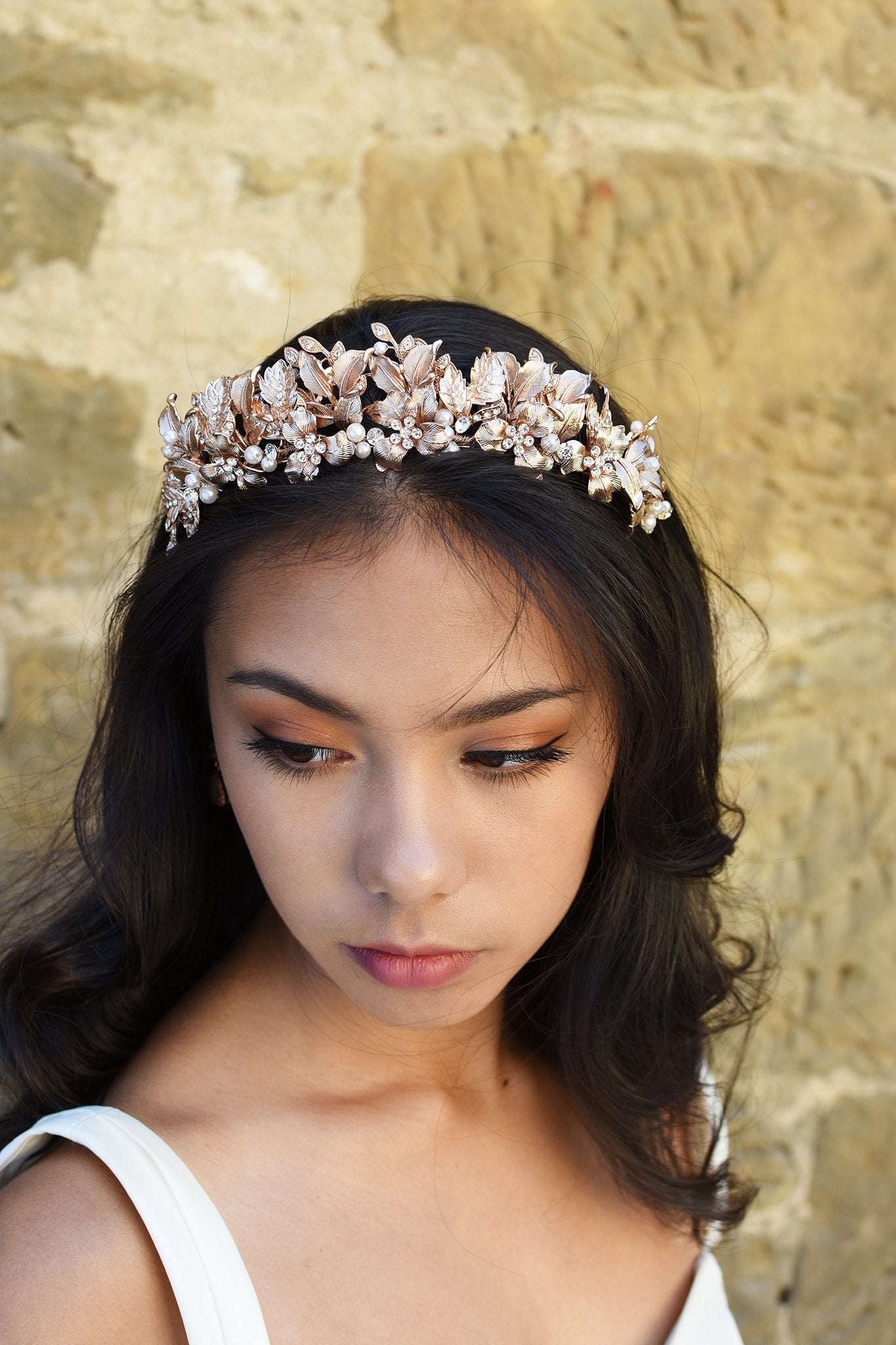 A beautiful floral statement, Hannah is a gorgeous pale rose gold bridal headpiece. An arrangement of rose gold pearlescent leaves and floral elements embellished with tiny pearls and crystals combine to create a sweet sensation that is Hannah. With delicate crystal and pearl detailing, Hannah will radiate with beauty and elegance atop of your head. Lightweight and easily adjusted for individual comfort and style preference, Hannah will have you looking like a picture-perfect princess.