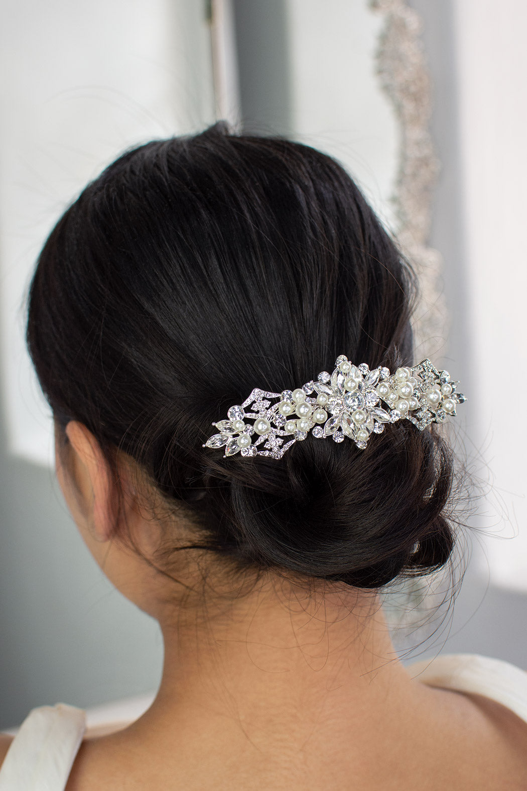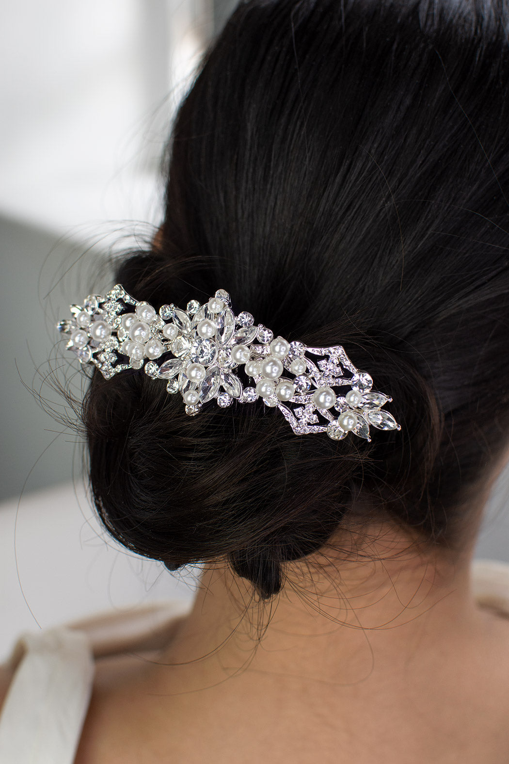 With the Audrina Silver Side Comb, you will walk down the aisle with confidence and grace on your special day. This stunning art deco side comb is the perfect addition to an up-do hairstyle and sits at the top of a veil perfectly. A crystallised piece that offers a kaleidoscope of detail in the many encrusted crystals with radiant elements of pearl. Forming a flower like motif and graduating in size at either end, Audrina is a masterpiece that offers modern elegance and bridal beauty. You wedding day wouldn't be the same without Audrina.