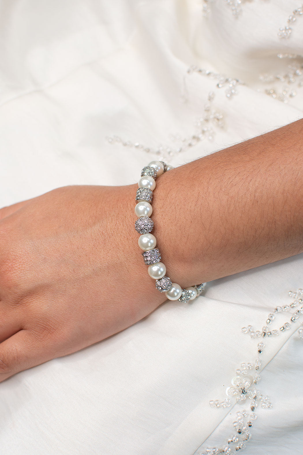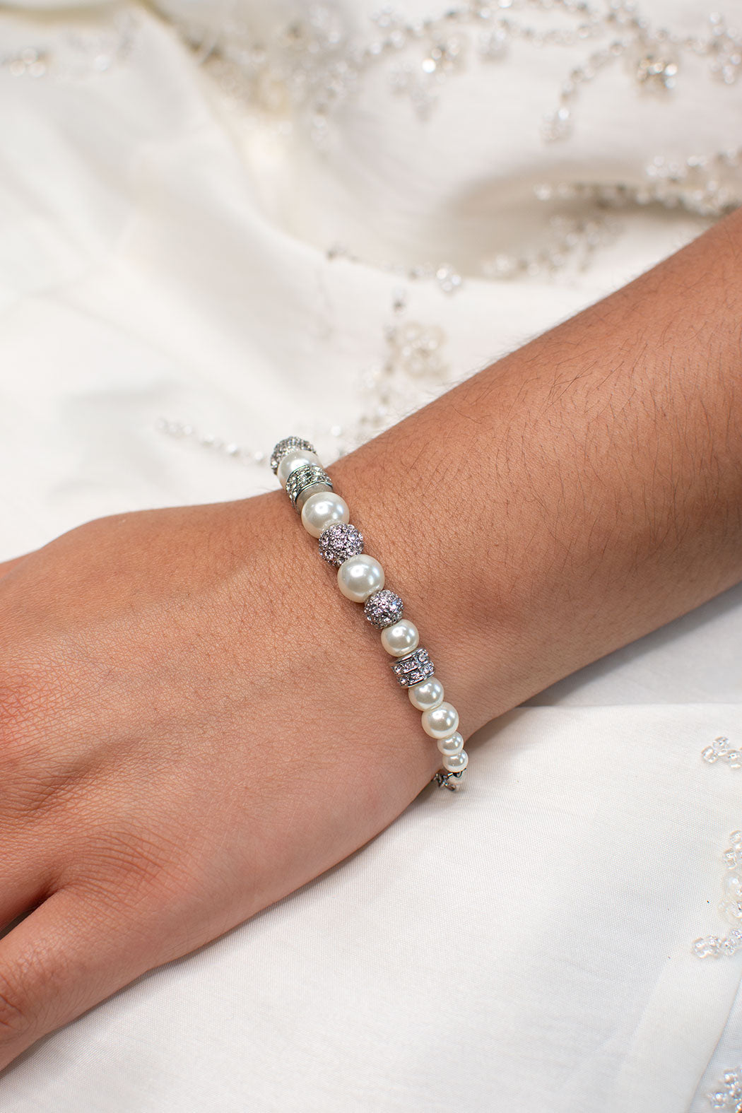 The Brooklyn Bracelet is the epitome of bridal style. Pearls alternating with shining disco balls of silver crystal add a dazzling sparkle to your bridal look. Bracelets are a magnificent way to tie together your bridal look with your bridesmaids so why not treat them all! Brooklyn is a wonderful bracelet that will go with all bridal styles and all dresses. A classic bracelet that you can wear long after your big day. Make memories with the Brooklyn Bracelet.