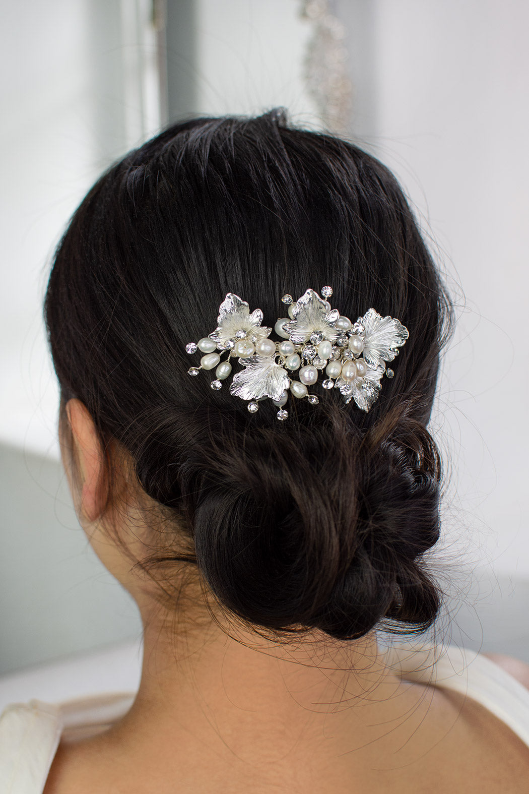 Cilla is a two tone side comb with soft Silver pearlised leaves with fine bright silver tipped edges surrounded by a halo of real freshwater pearls with tiny bright crystals. With a comb fitting Cilla is a smaller size side comb and a perfect match for beach or garden style Bridal looks, matching perfectly with champagne tone dresses. Cilla is also available in Pale Gold.