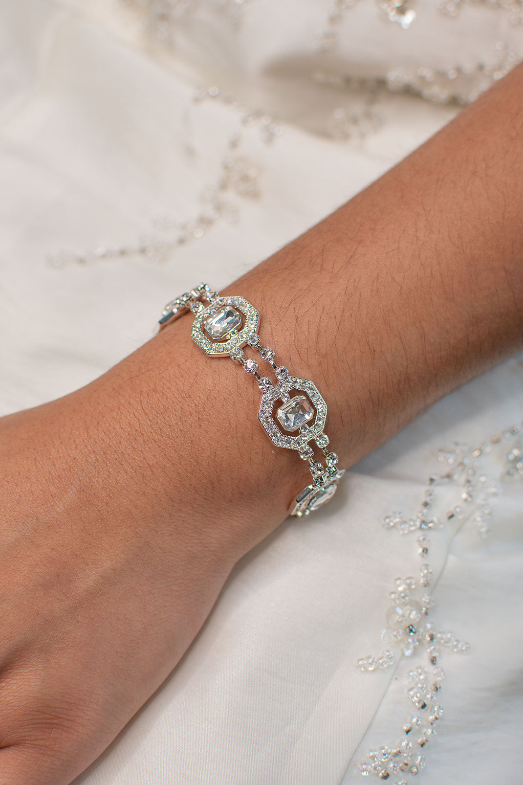 Reminiscent of small square church windows, the light shines through the large crystals of our Evangeline Bracelet. Highly detailed frames of tiny crystal decorate the large windows of gleaming light. Evangeline is a bright bracelet that will catch your eye as you twirl in the sun. Fall in love with the Evangeline Bracelet, and make memories that you will cherish for years to come.