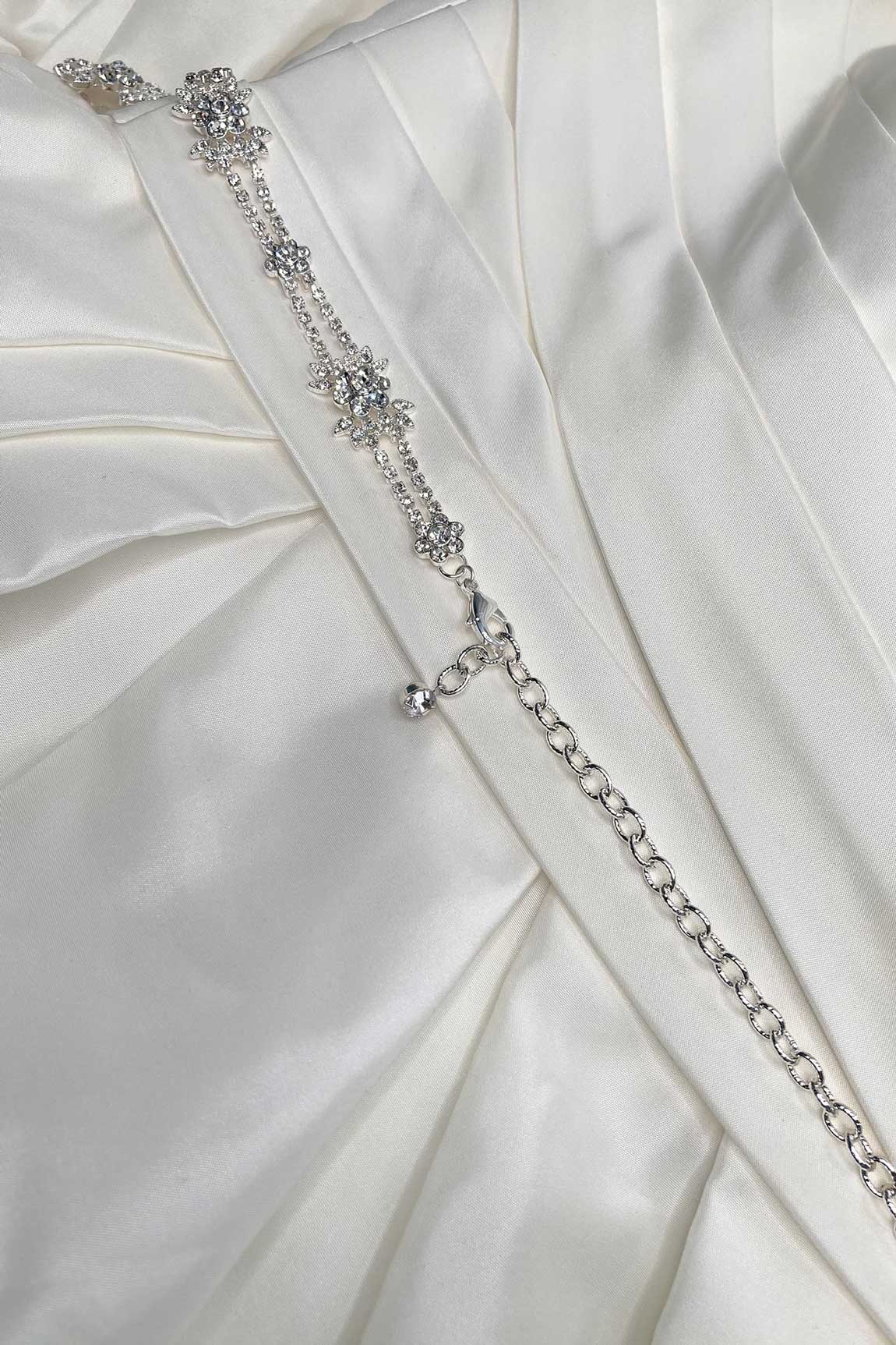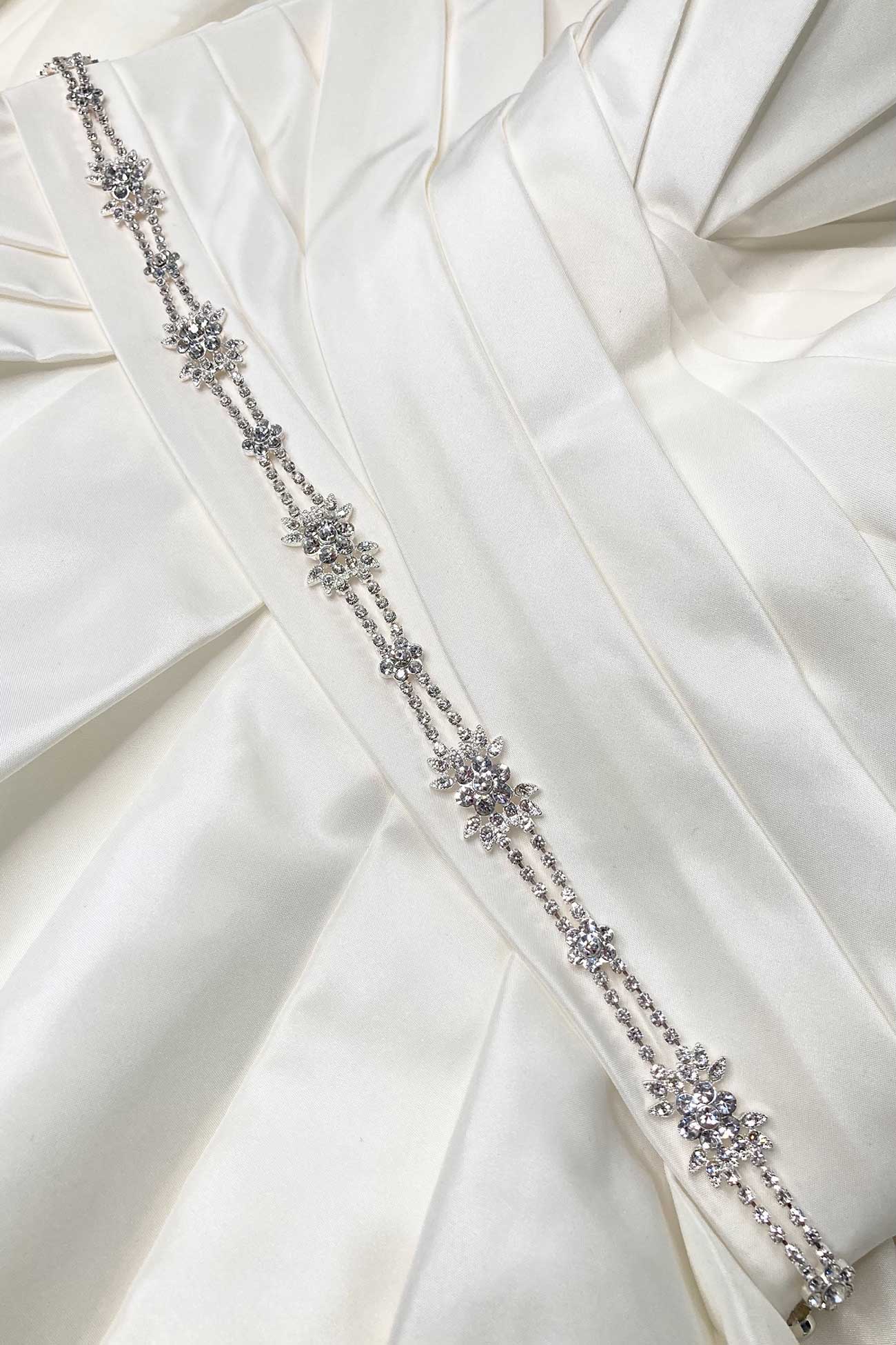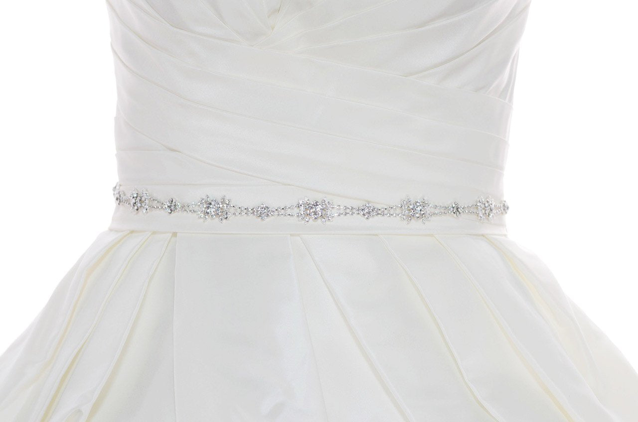 Please choose the style of belt you would like(chain or ribbon) in the drop down menu. The Gisele Belt in Bright Silver is an incredibly versatile belt perfect for the whole bridal party and formal wear too.