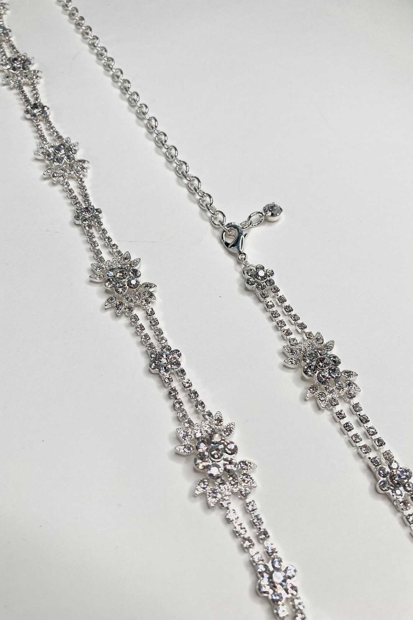 The Gisele is a gorgeous narrow silver belt (1.5cm wide). It features a 60cm crystal-encrusted antique style motif. This design is available as a chain belt 1 metre long inn total or on a narrow diamond white 3m ribbon with the ends of the ribbon trimmed with diamanté stones, this design is a true bridal beauty. The Gisele chain Belt comes with a 40cm extension chain and parrot clip.