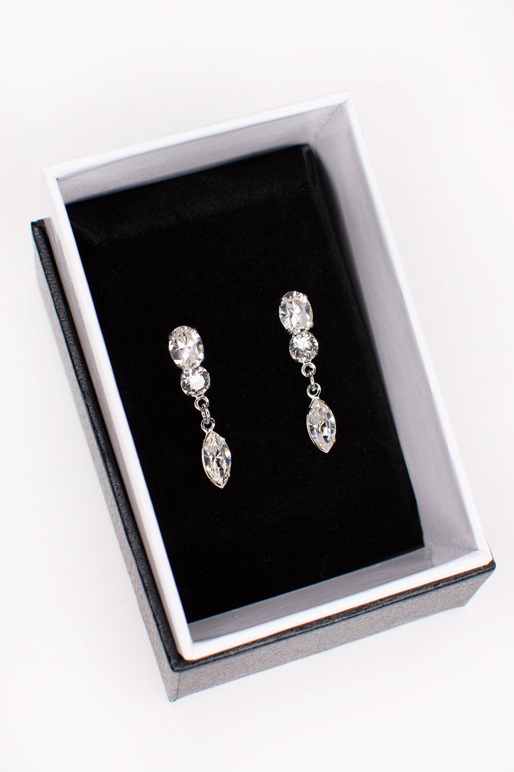 Below Margot's two circular base stones hangs a single shining navette-shaped stone that sways and dances beautifully with movement, glimmering as it catches the light. Simple yet radiant, Margot is a perfect touch to any Bridal or Formal ensemble.