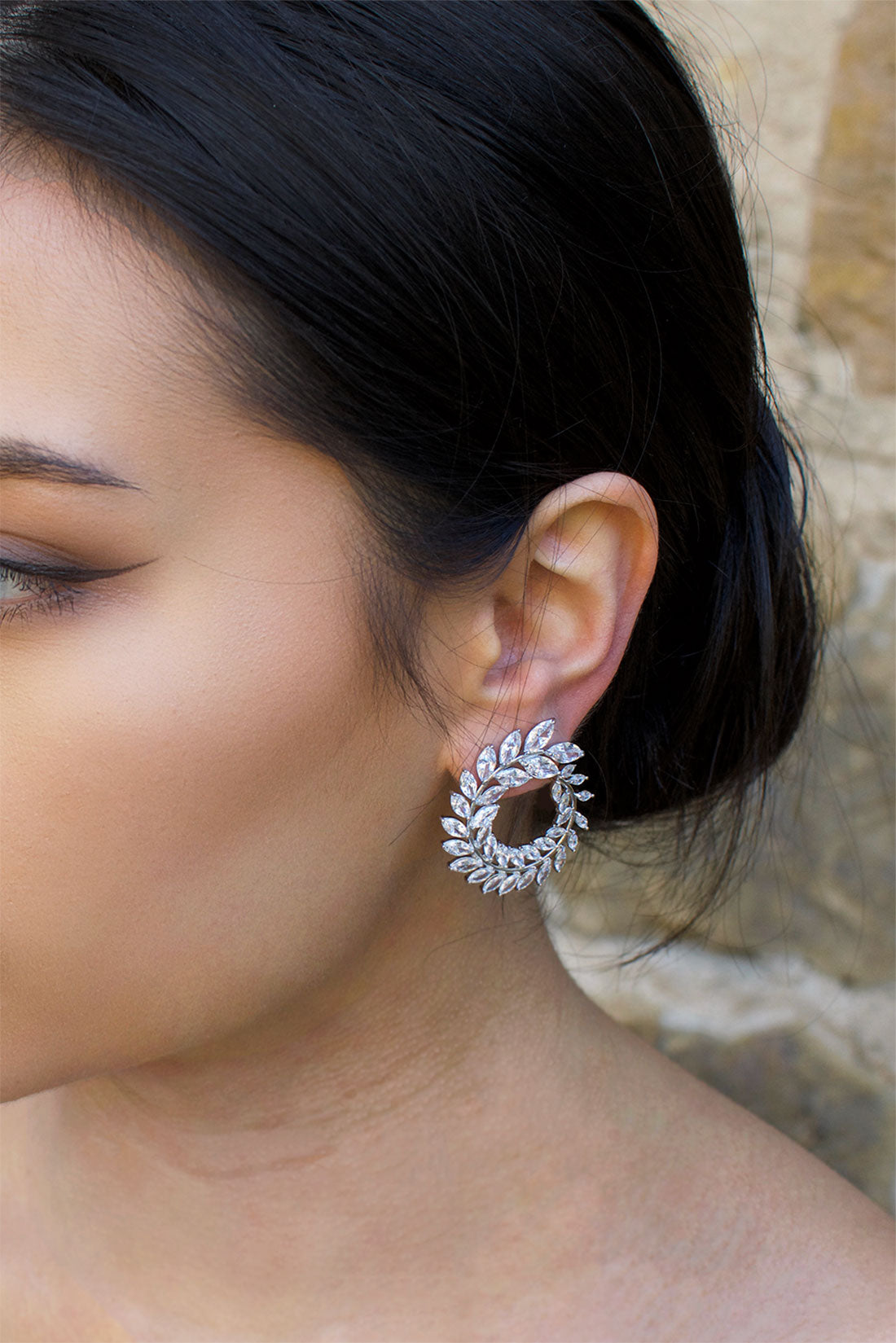 A bold statement earring, Natasha is a divine design of tiny open back Navette-shaped zirconia crystals that graduate down in size as they whirl around in a stunning spiral. Made with a gleaming Rhodium finish, this pair of earrings are lightweight and dazzling and are sure to capture the attention of all.