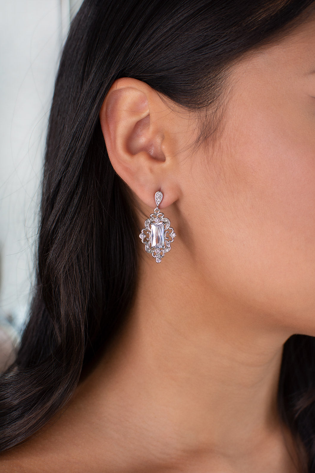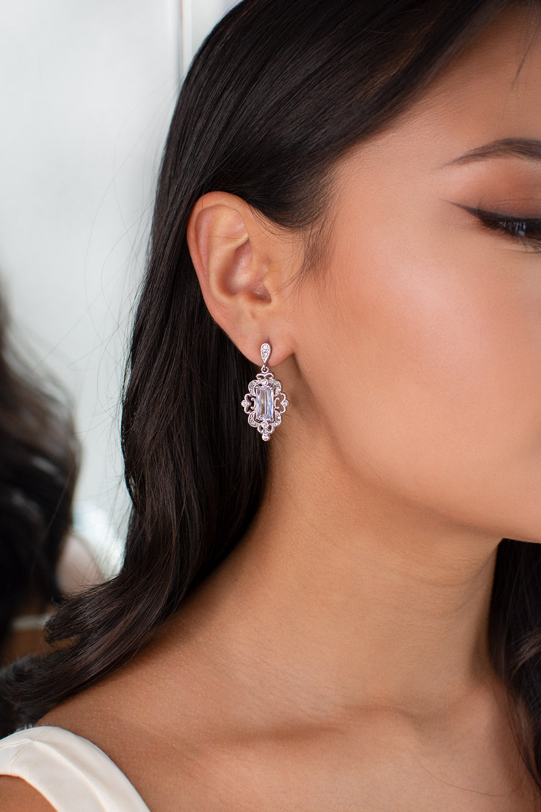Look divine on your wedding day in the Vintage inspired Aida earrings. Truly Old World glamour these earrings are made in an elegant filigree setting with a rhodium (dark silver) finish featuring a longer rectangle crystal stone with an open back. They are an imitation of a design from the glamour era of the 1920 and they have that Art Deco charm. With post fittings they are light and simply beautiful.