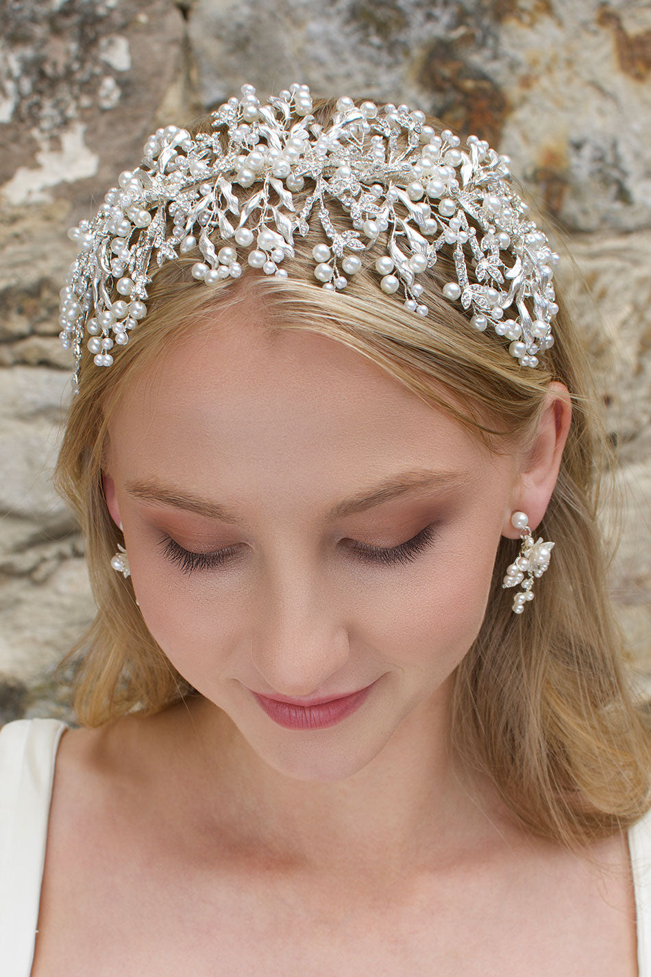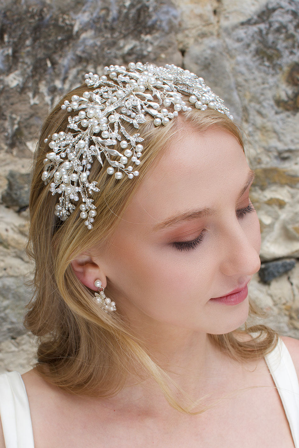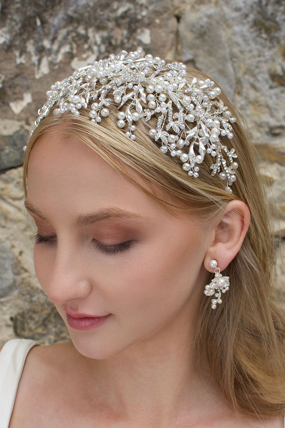 Alessandra adorns the head beautifully as the dainty materials stretch from the base to decorate the hair. The metal leaves are encrusted with dainty stones that sparkle and shine in the light, a perfect finishing touch for all bridal looks.